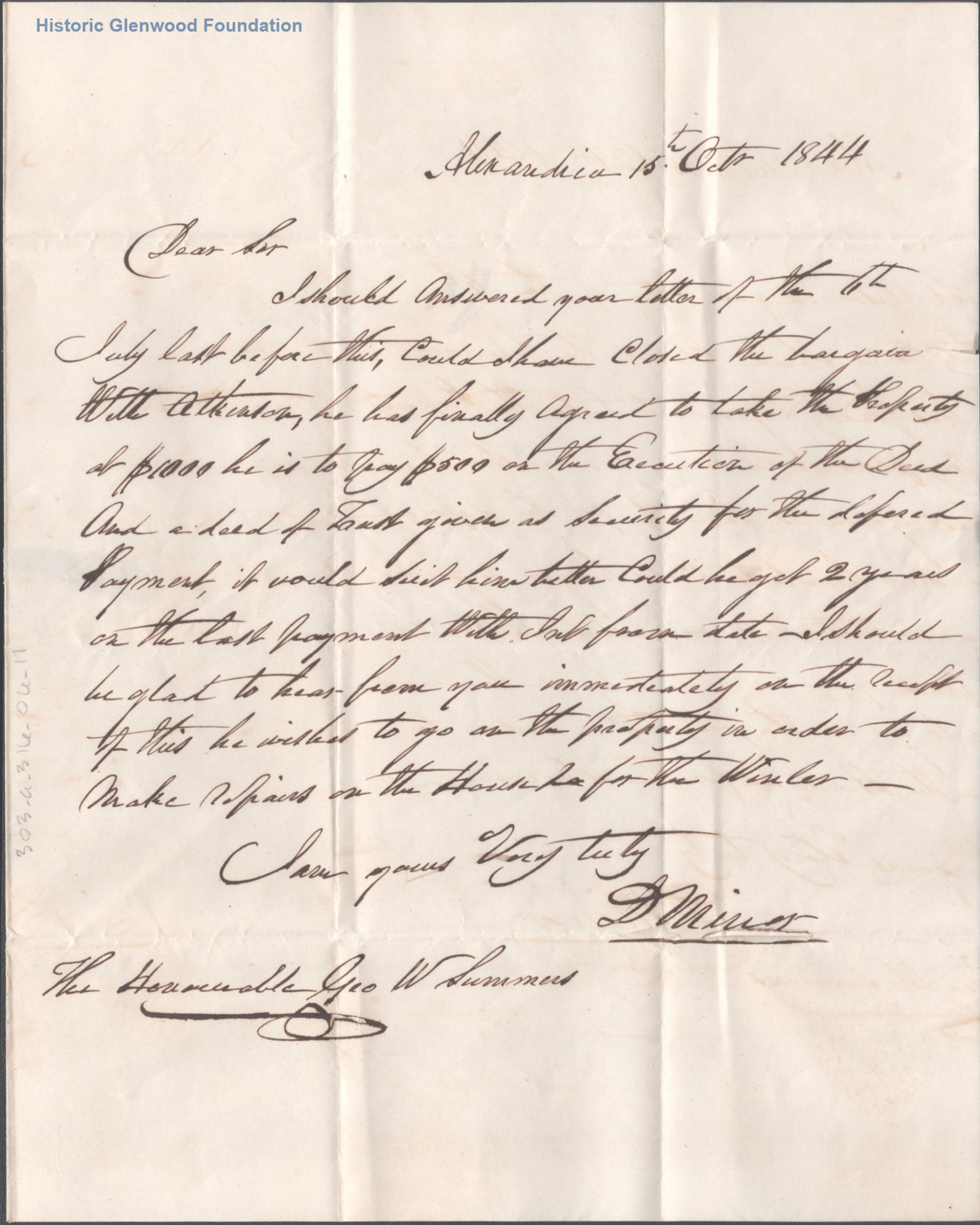 Correspondence with legal client: D. Minor; October 15, 1844