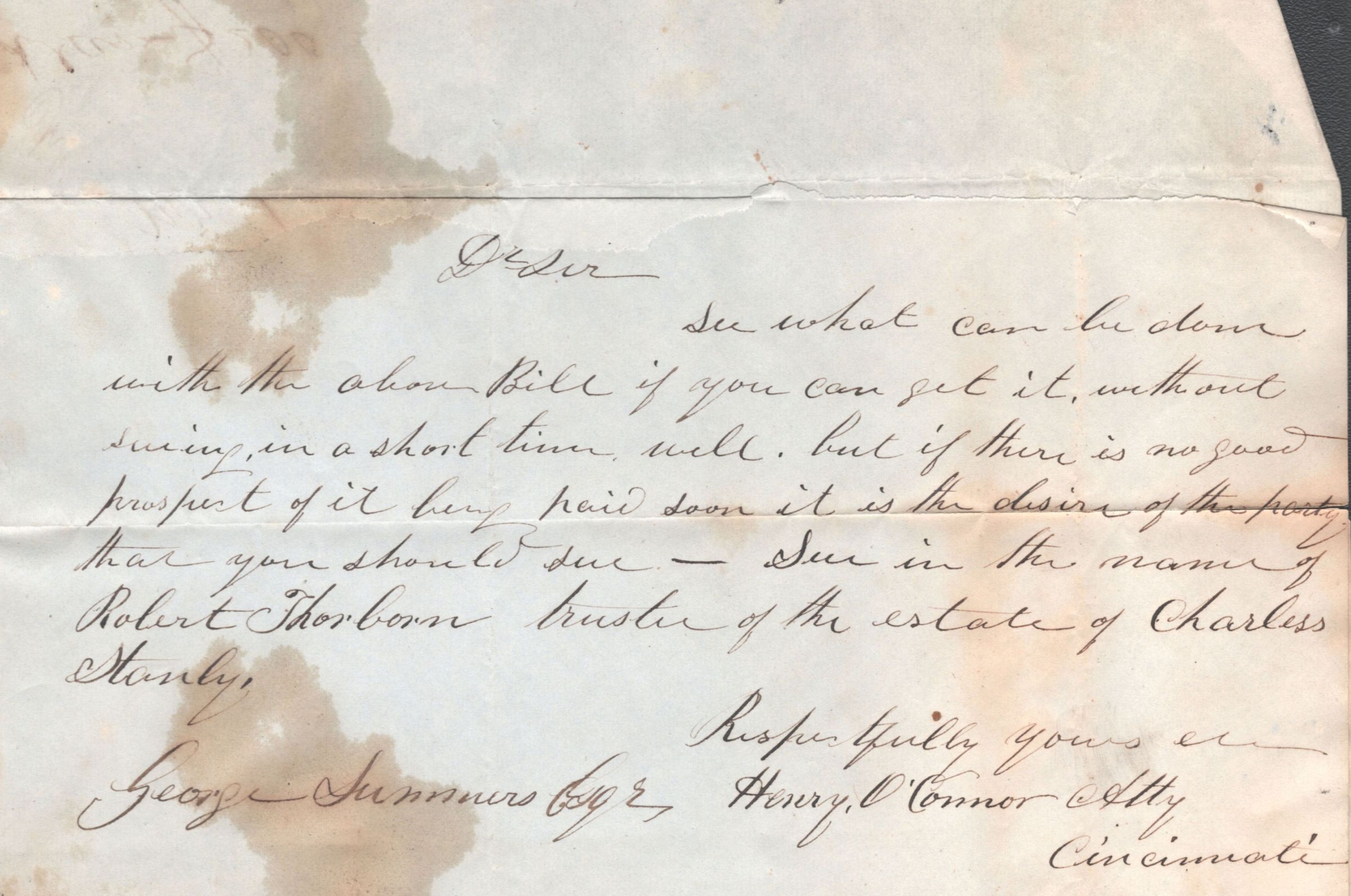Note to George Summers from attorney Henry O'Connor in Cincinnati, OH., requesting Summers to collect a debt on behalf of Robert Thorborn who is trustee of of the estate of Charles Stanley. O'Connor further instructs that Summers file suit if debt cannot be collected.Date(s) of Creation