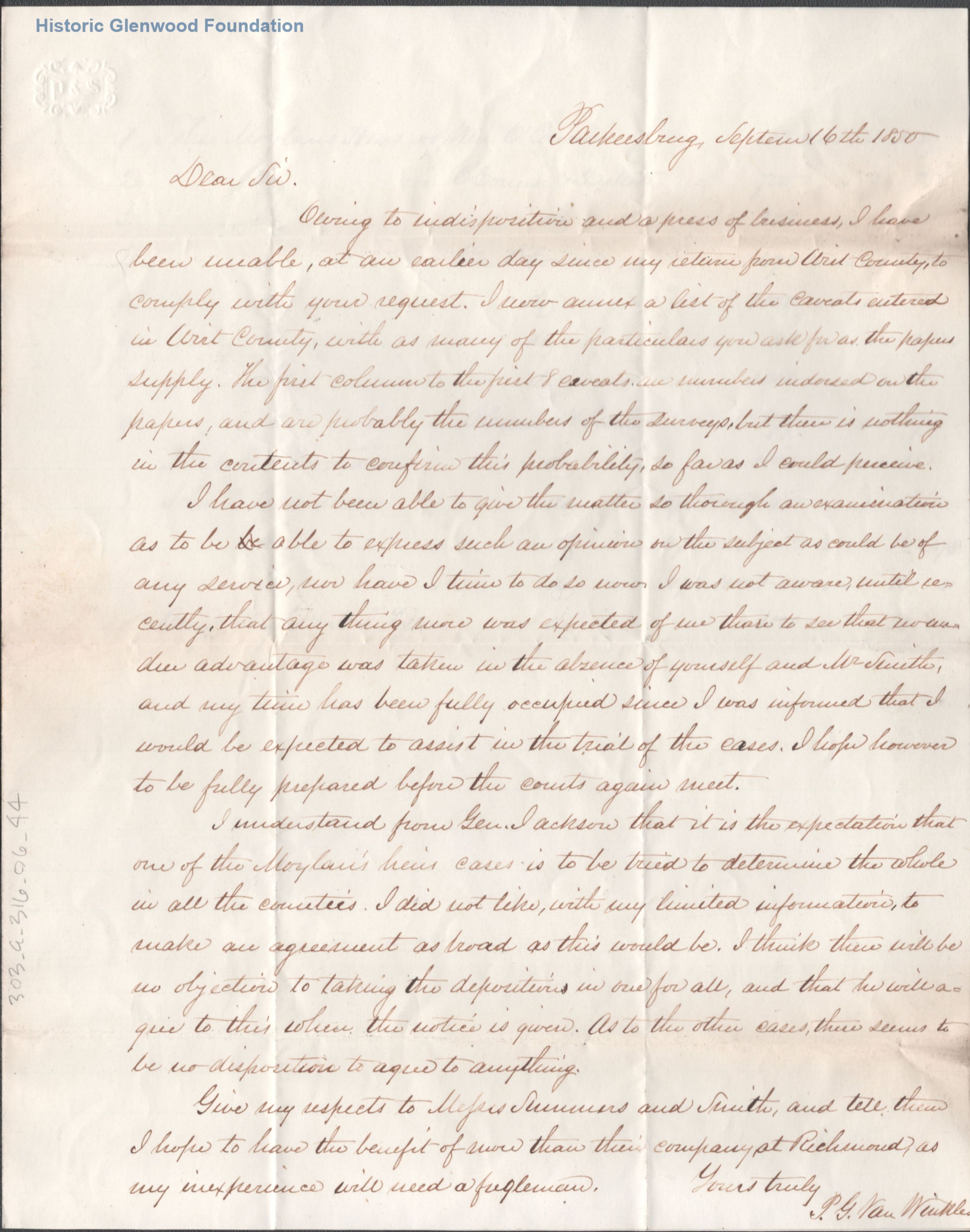 Correspondence with legal client: P. G. Van Winkle; September 16, 1850
