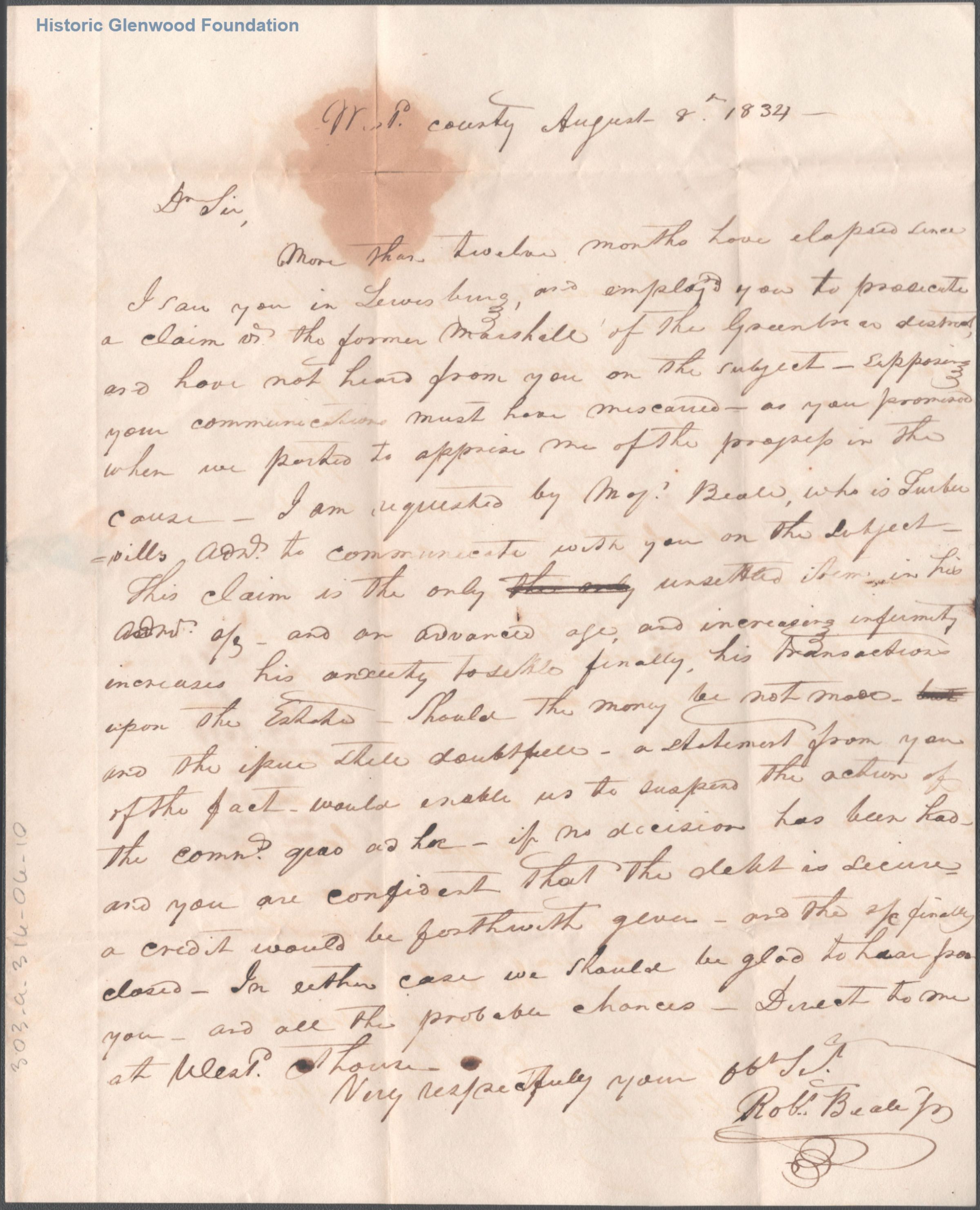 Correspondence with legal client: Robert Beale; August 8, 1834
