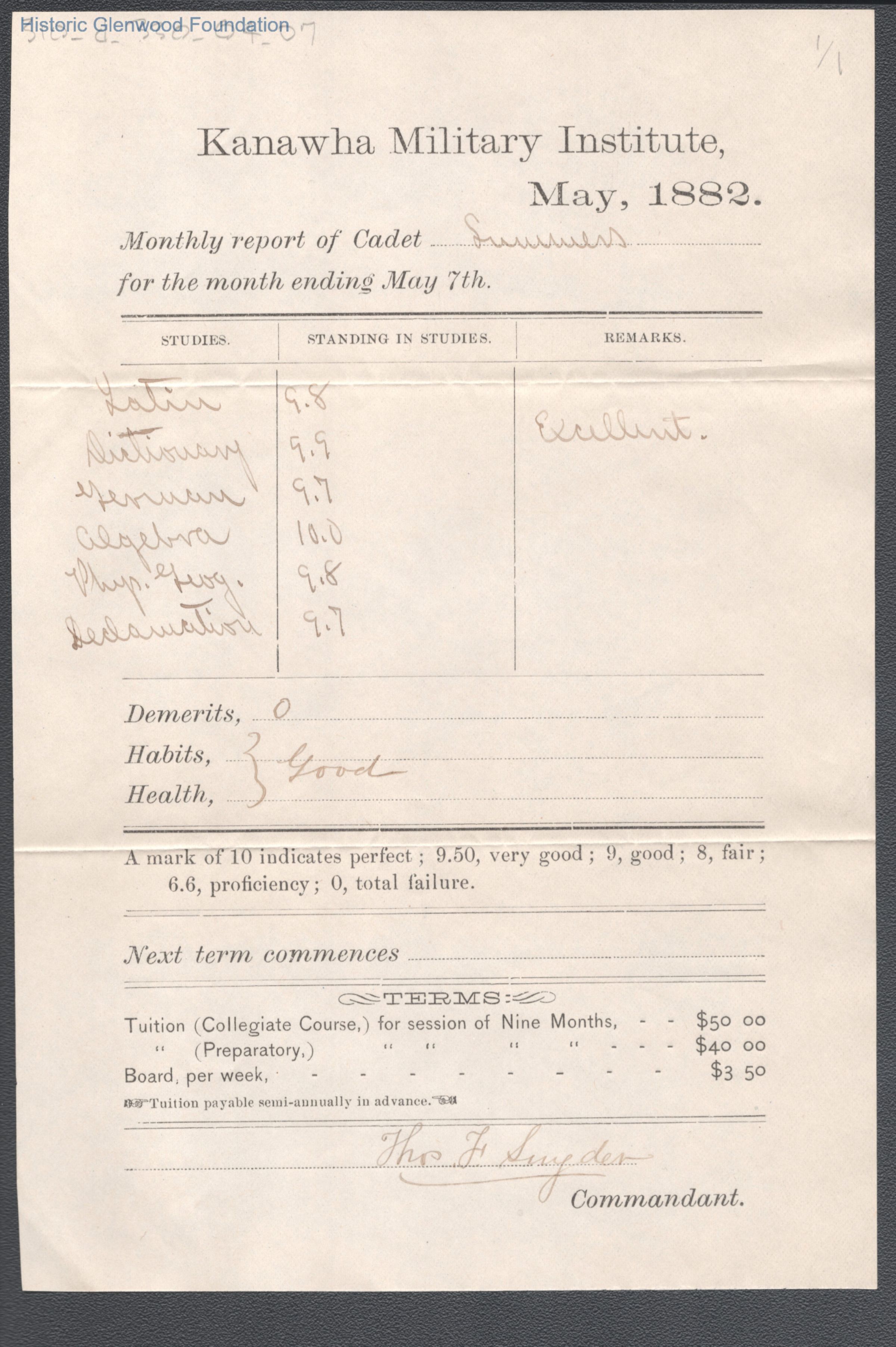 George W. Summers Progress Report, Kanawha Military Institute, May 7, 1882.