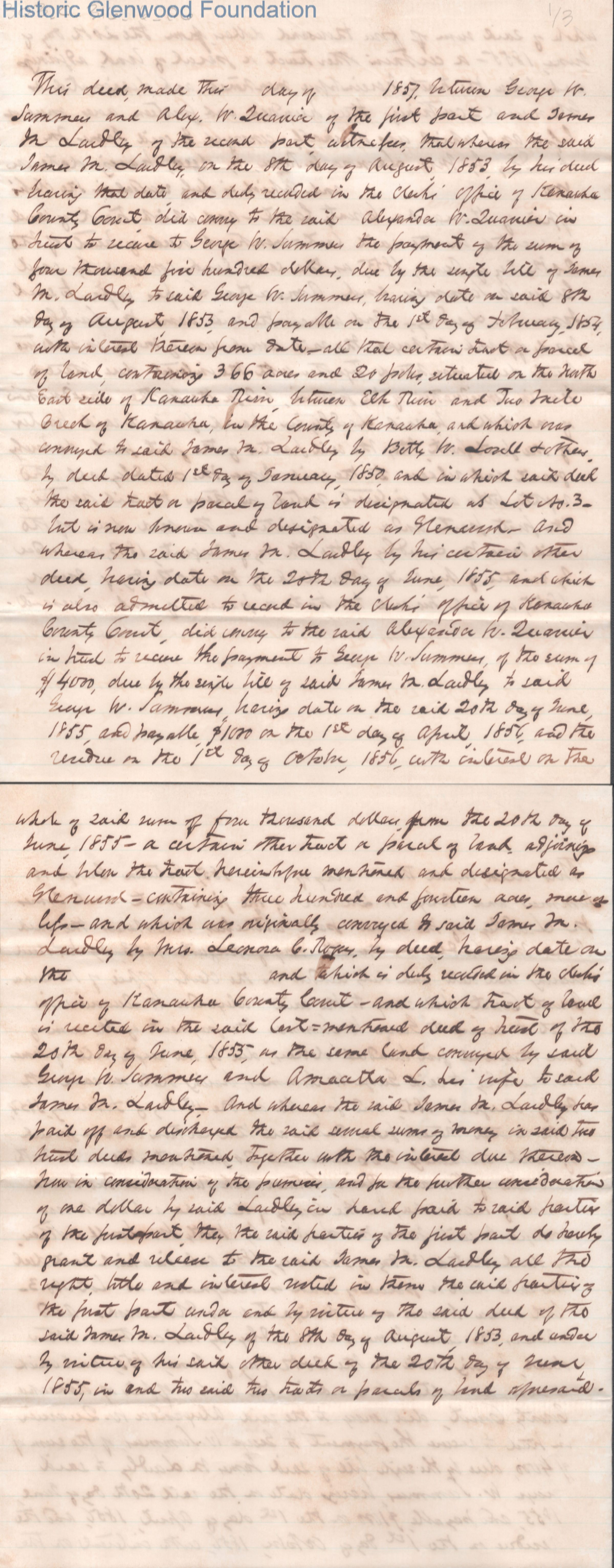 Deed for Transfer of Glenwood between Judge George Summers and Alexander W. Quarrier and James M. Laidley, 1857.