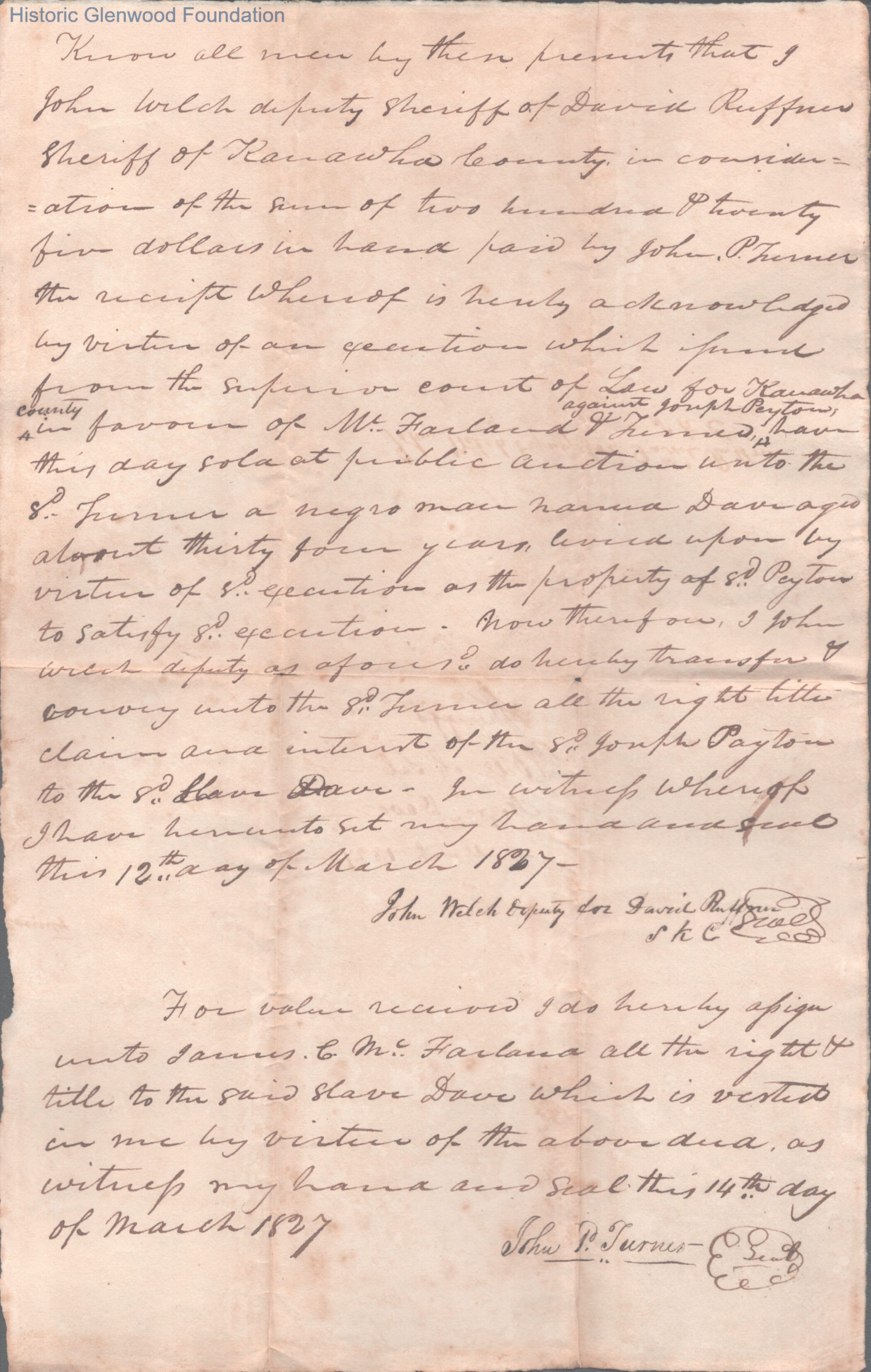 Kanawha Sheriff Receipt for Payment of Auctioned Slave, Mar 12, 1827.