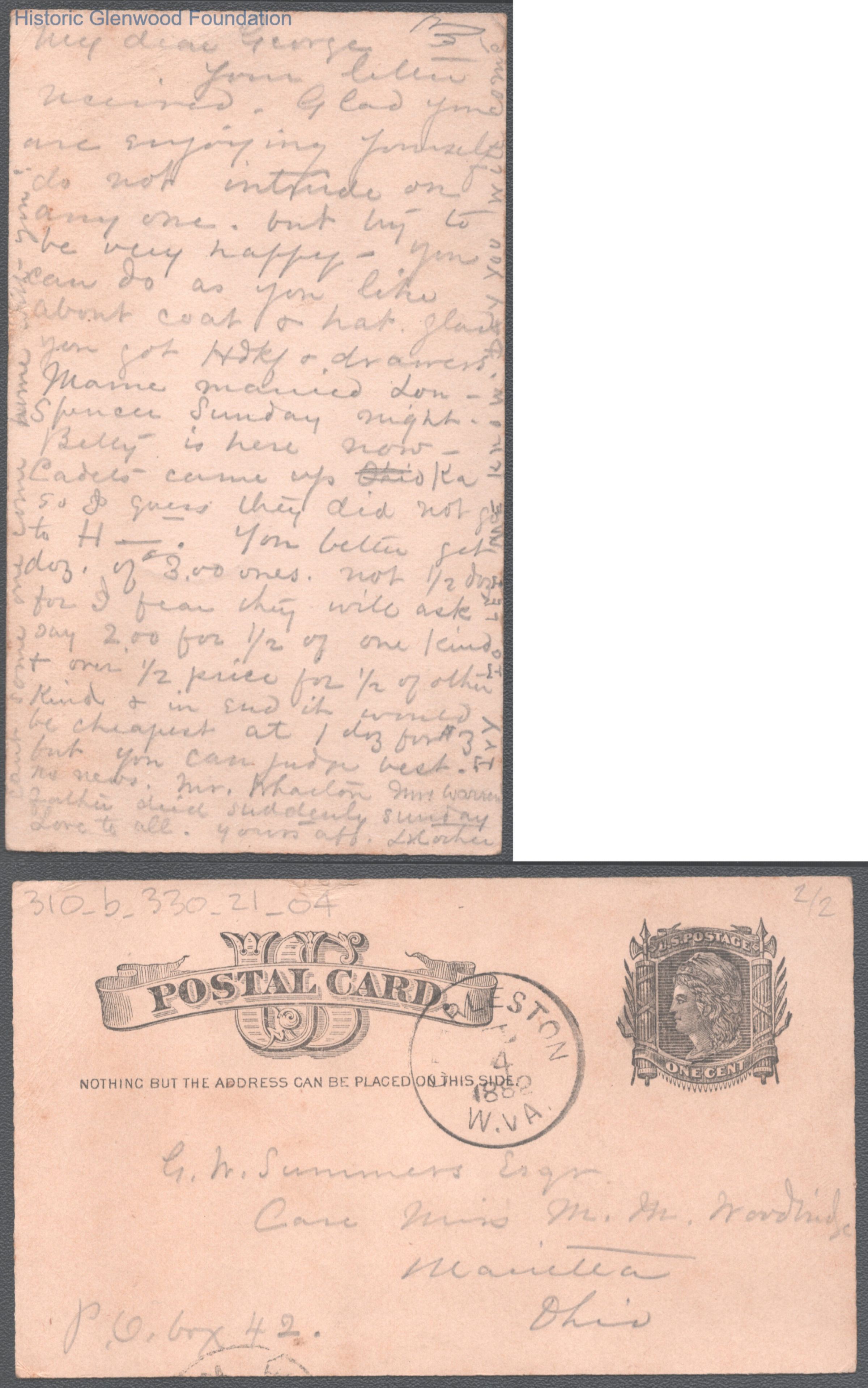 Postcard to George W. Summers from his mother Lucy W. Summers, c. 1882.