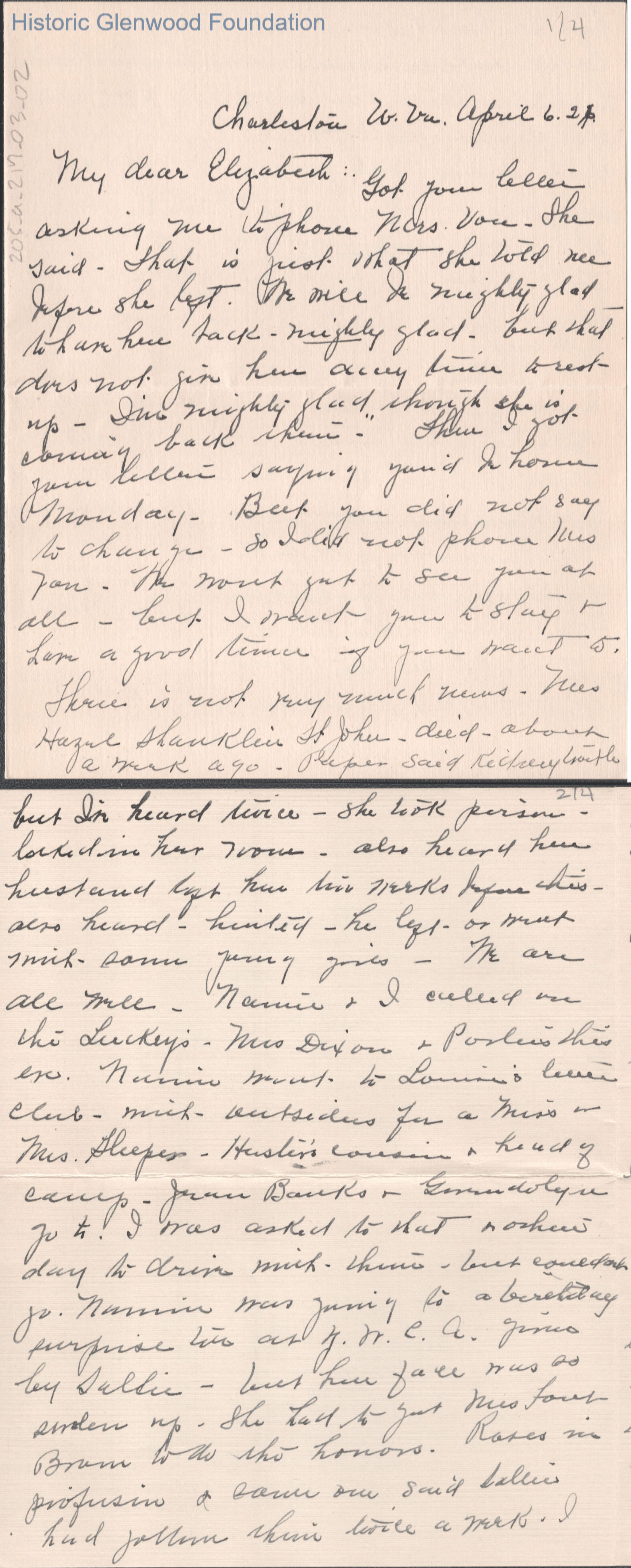 Four-page letter to Elizabeth G. Quarrier from her mother Elizabeth S. Quarrier, Apr 6, 1926.