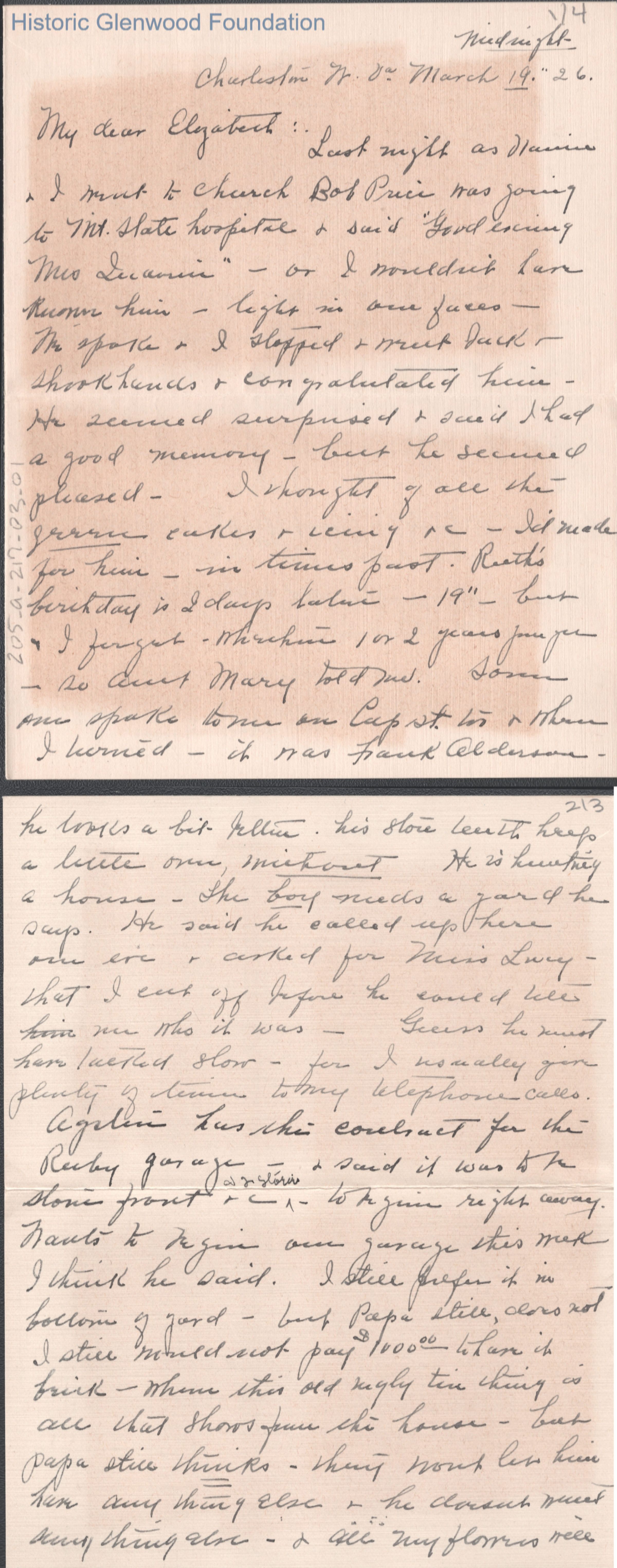 Four-page letter to Elizabeth G. Quarrier from her mother Elizabeth S. Quarrier, Mar 19, 1926.