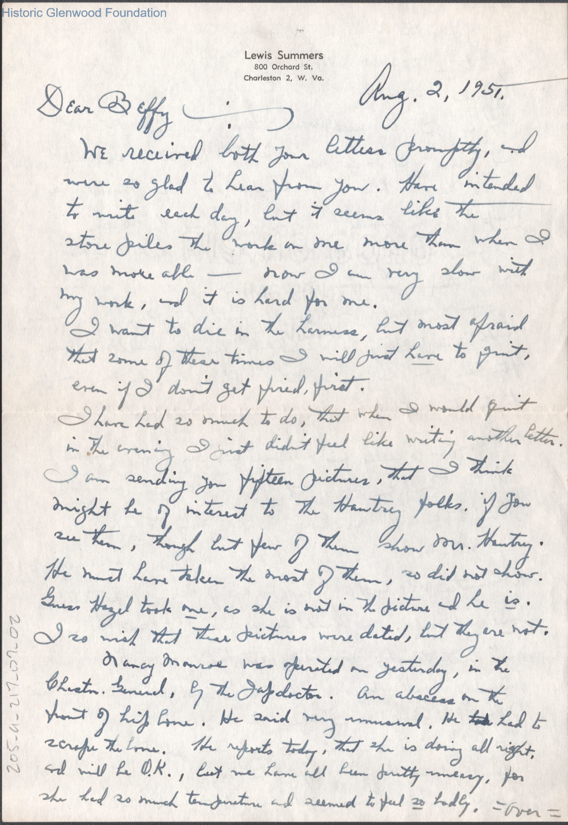 Two-page letter to Elizabeth G. Quarrier from Lewis Summers, Jr., Aug 2, 1951.