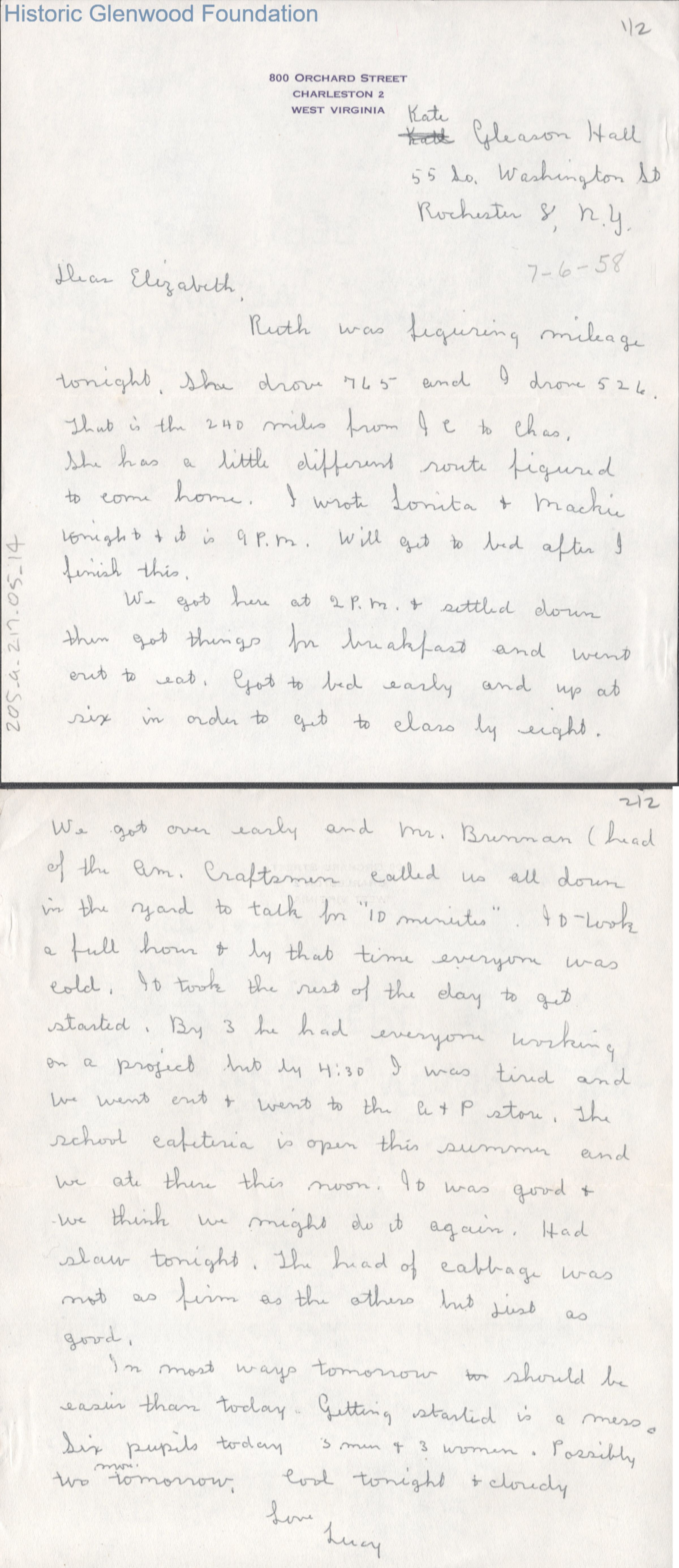 Two-page letter to Elizabeth G. Quarrier from Lucy S. Quarrier, Jul 6, 1958.