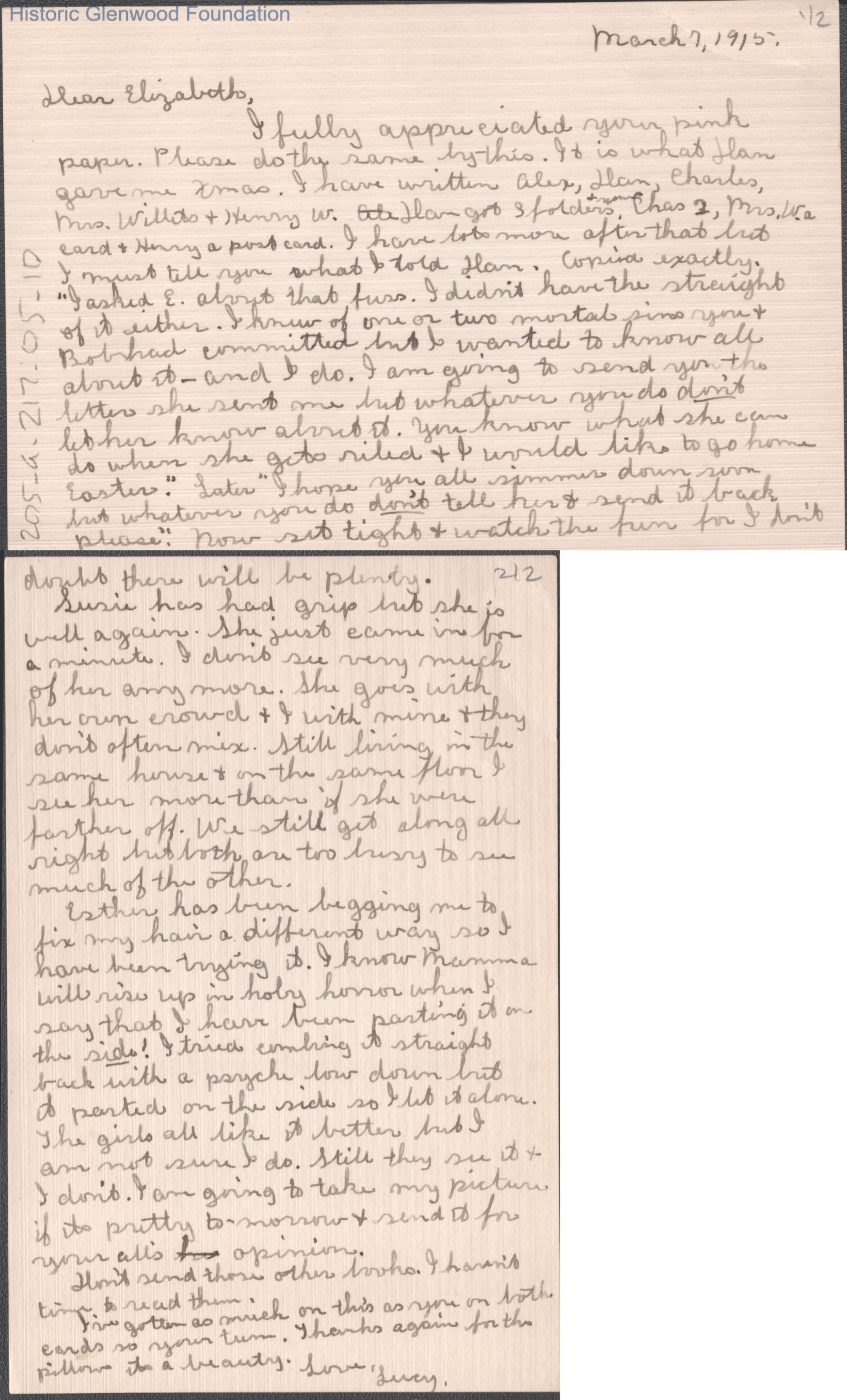 Two-page letter to Elizabeth G. Quarrier from Lucy S. Quarrier, Mar 7, 1915.