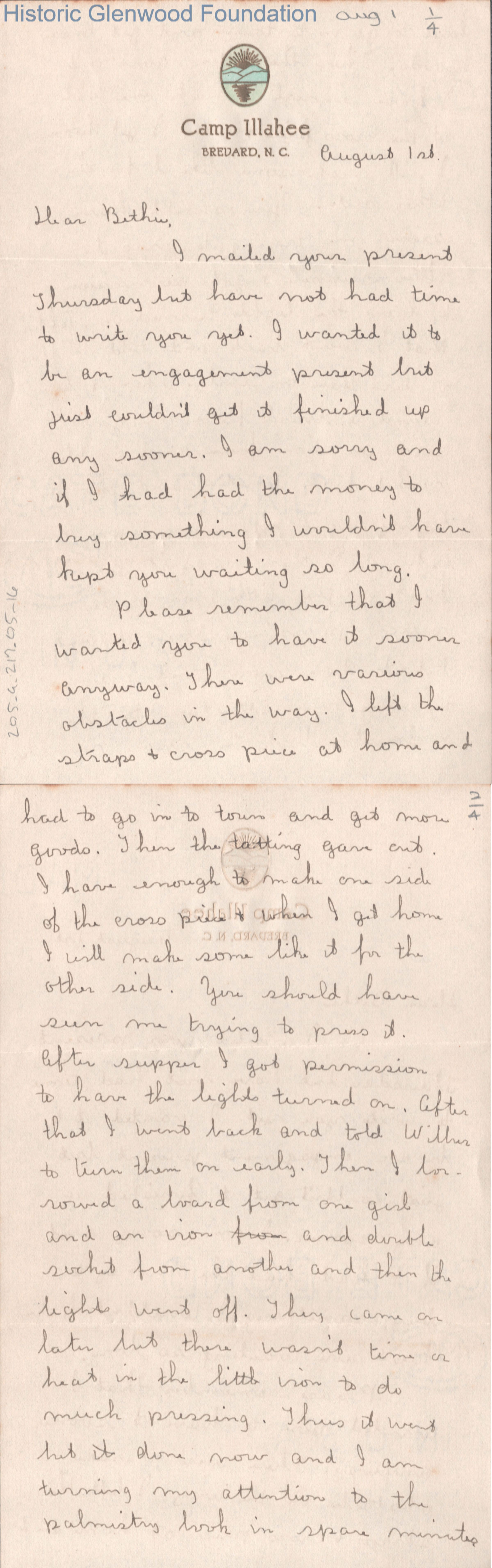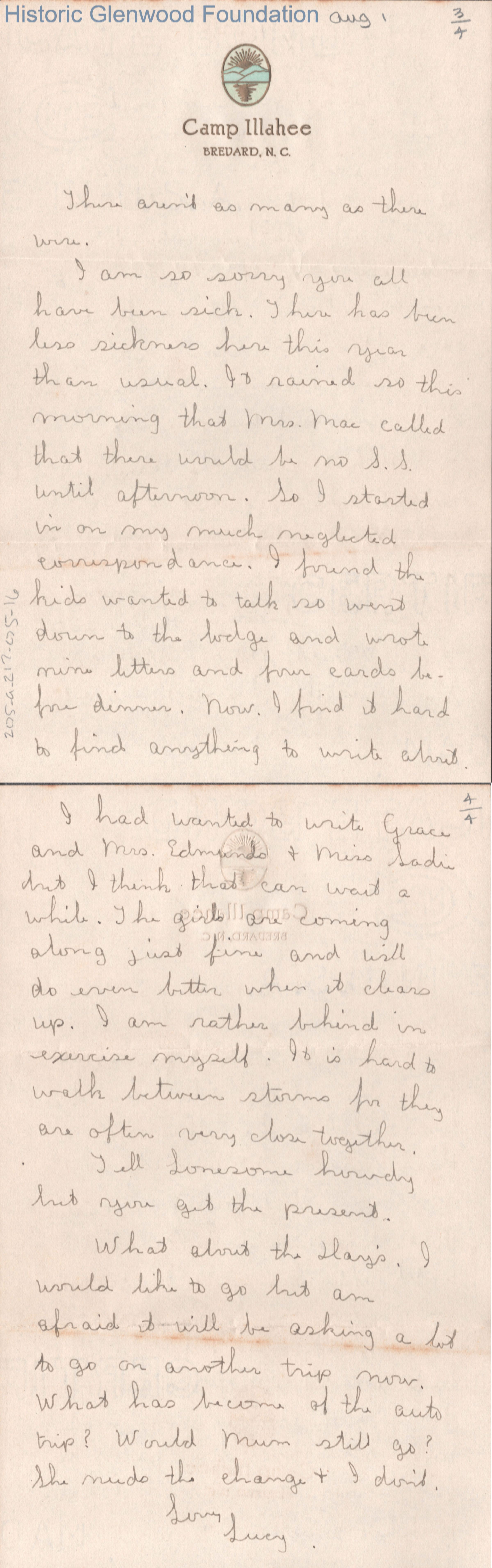 Four-page letter to Elizabeth G. Quarrier from Lucy S. Quarrier, unknown year ("August 1st" is noted).Creator