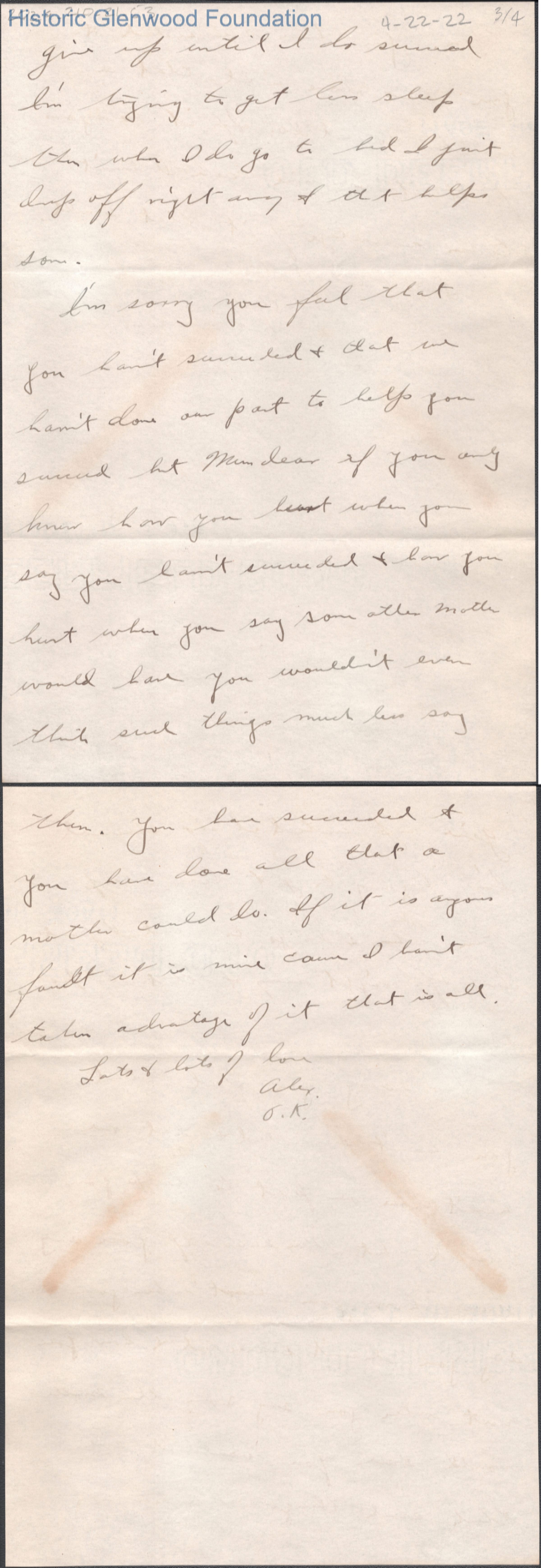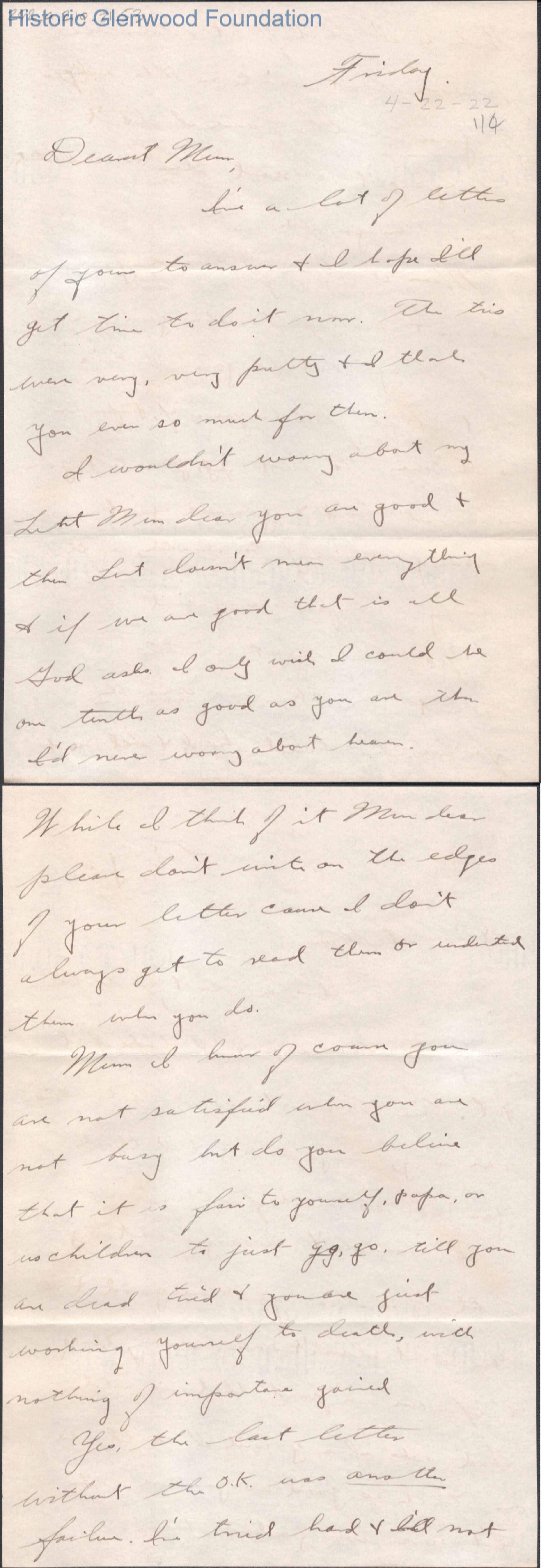 Four-page letter to Elizabeth S. Quarrier from her son Alexander W. Quarrier, Apr 22, 1922.