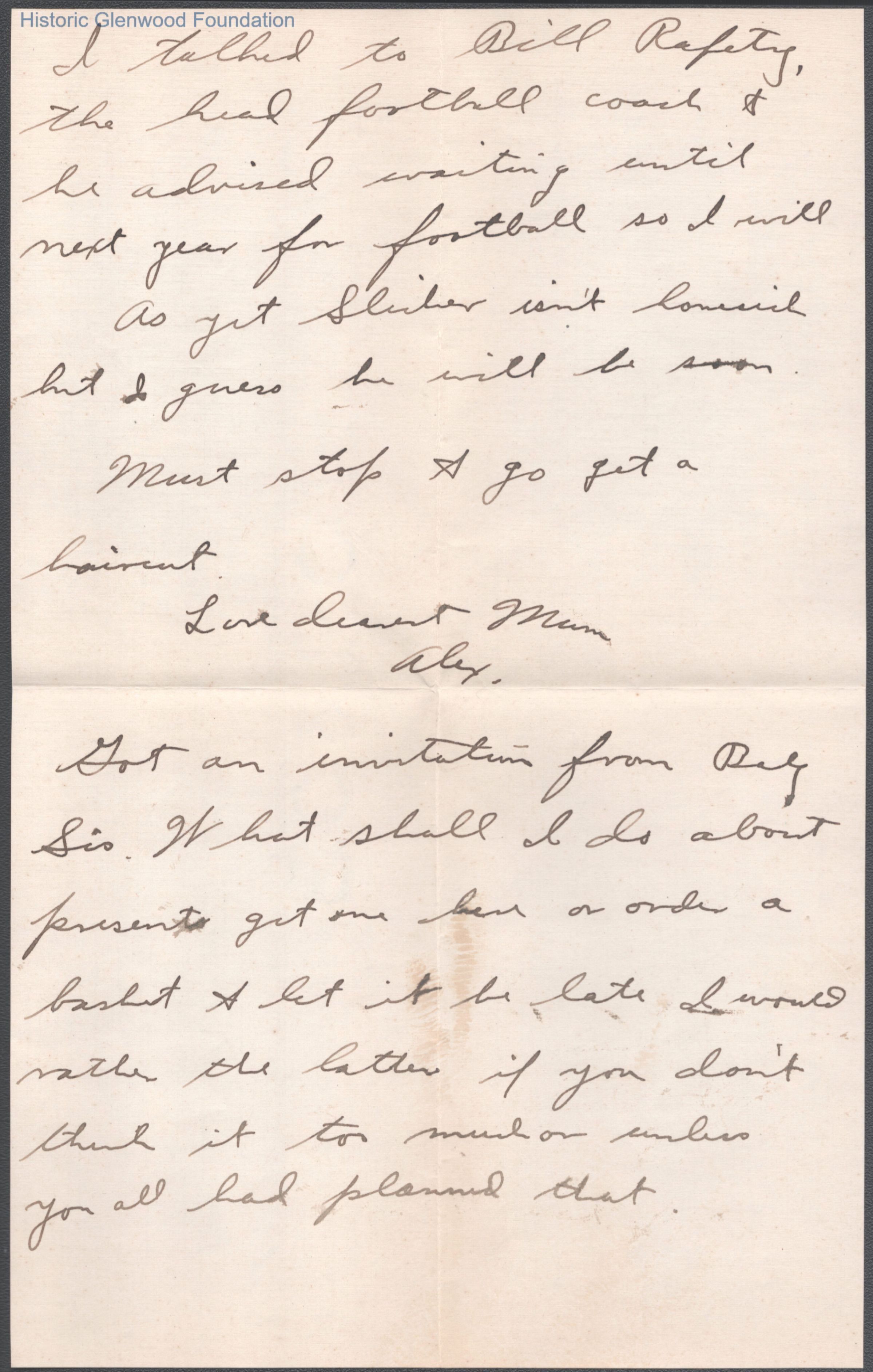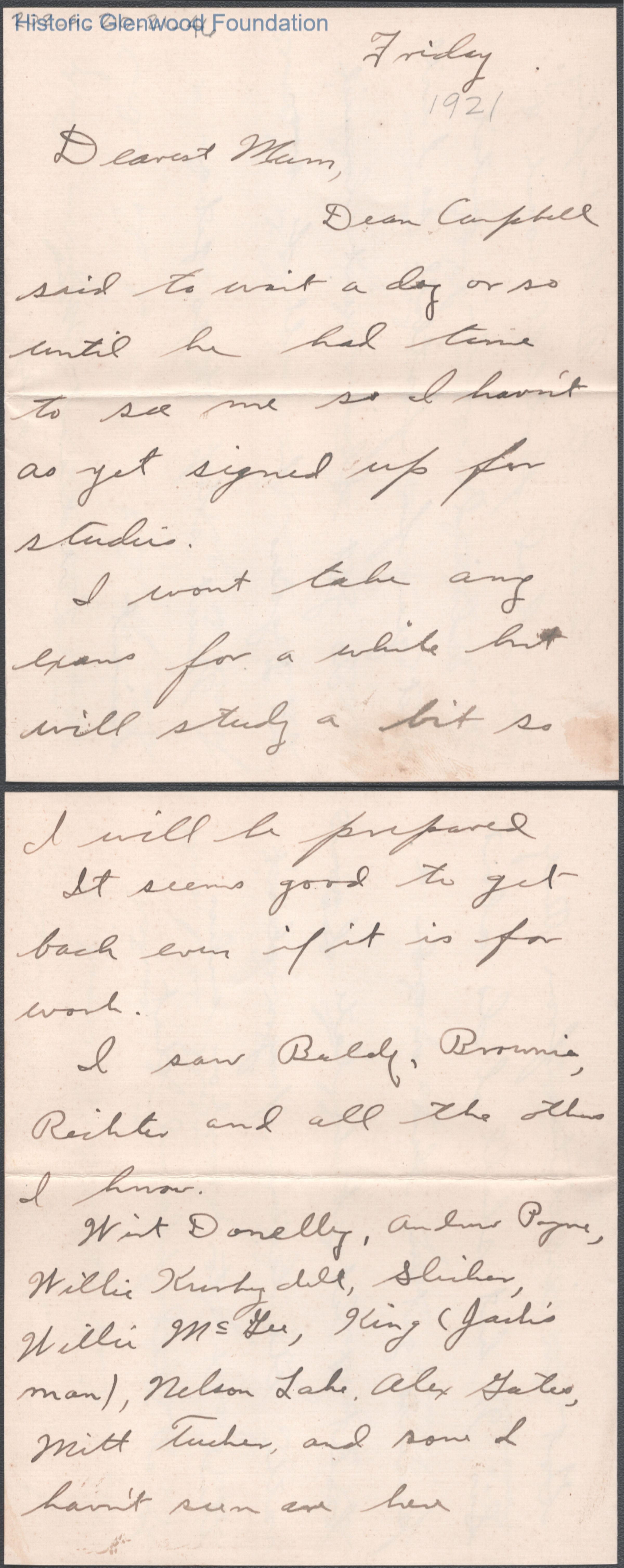 Three-page letter to Elizabeth S. Quarrier from her son Alexander W. Quarrier, c. 1921.