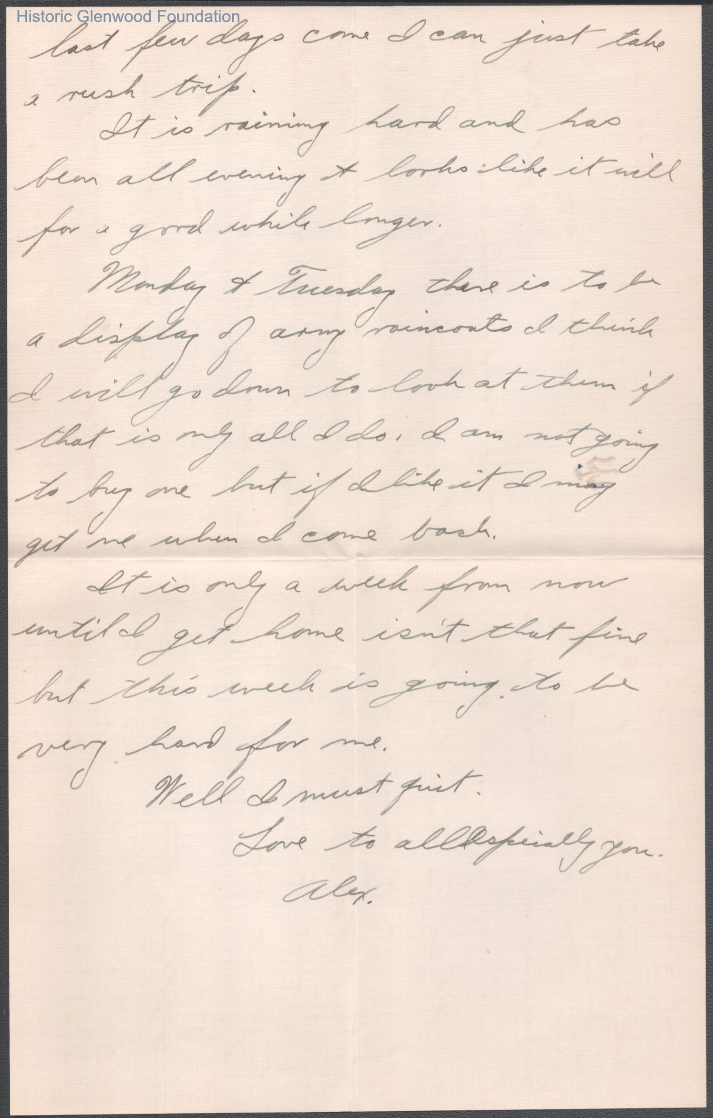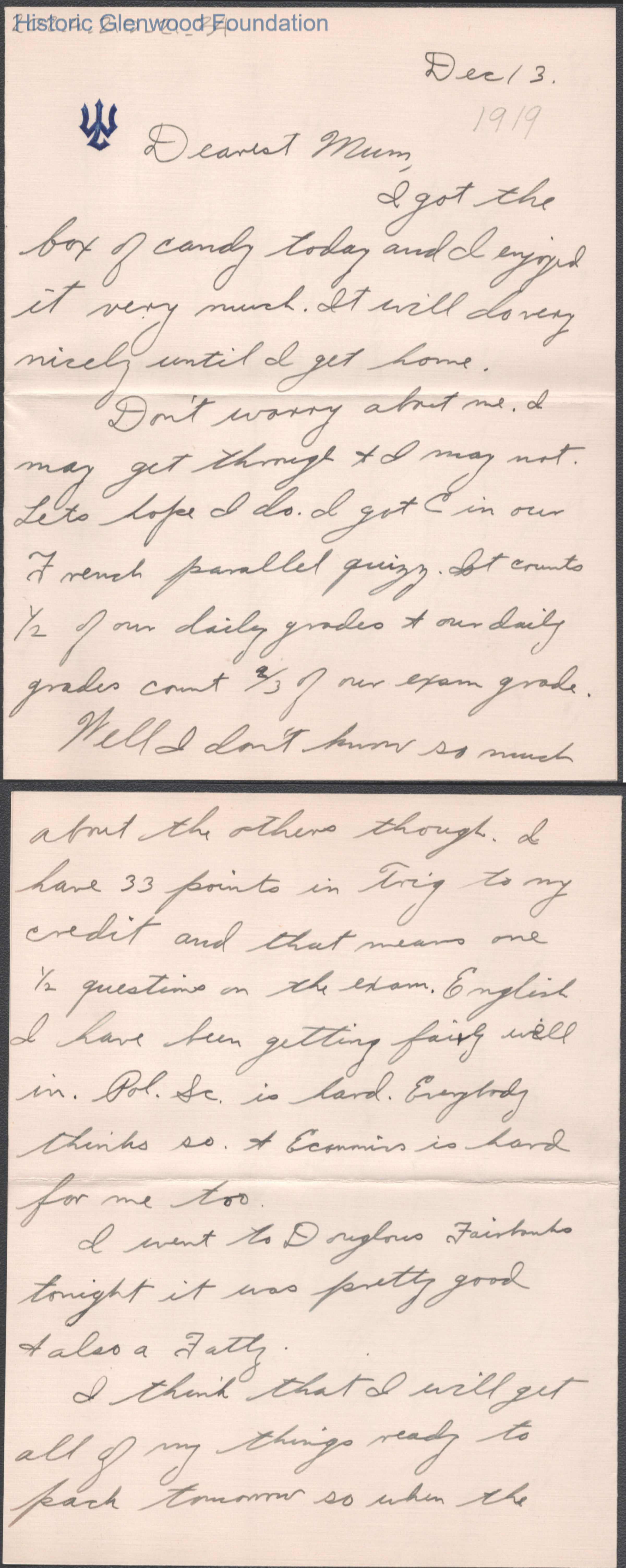 Three-page letter to Elizabeth S. Quarrier from her son Alexander W. Quarrier, dated Dec 13, 1919.