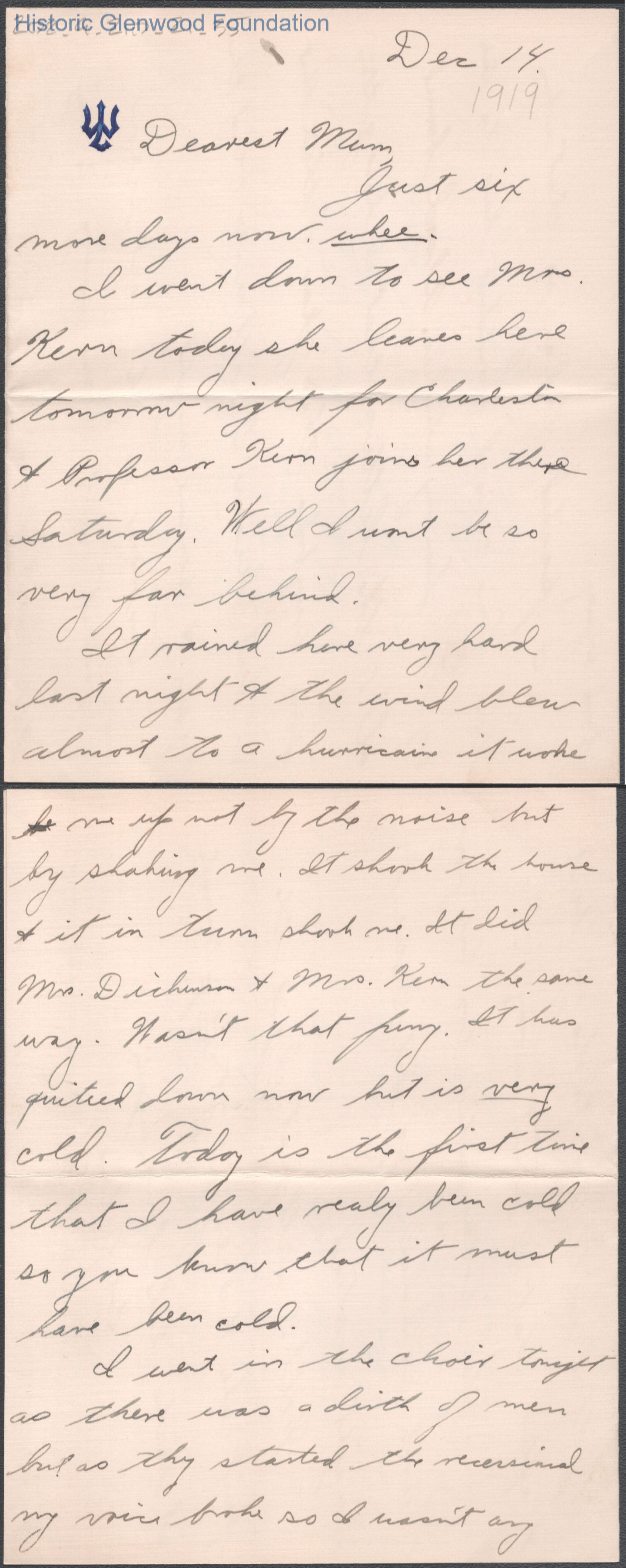 Three-page letter to Elizabeth S. Quarrier from her son Alexander W. Quarrier, dated Dec 14, 1919.