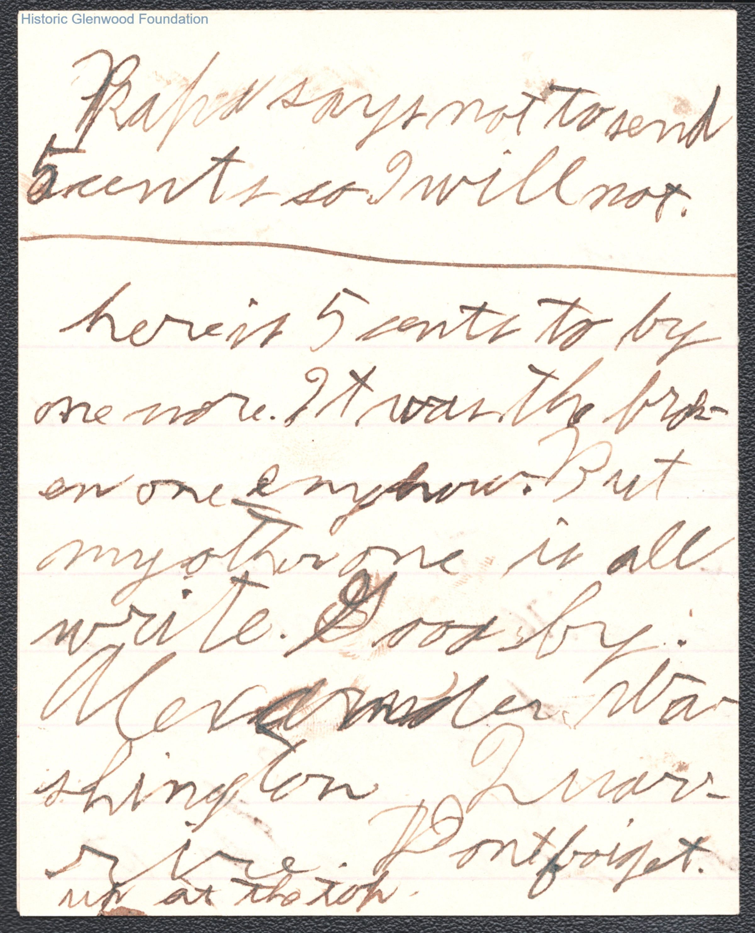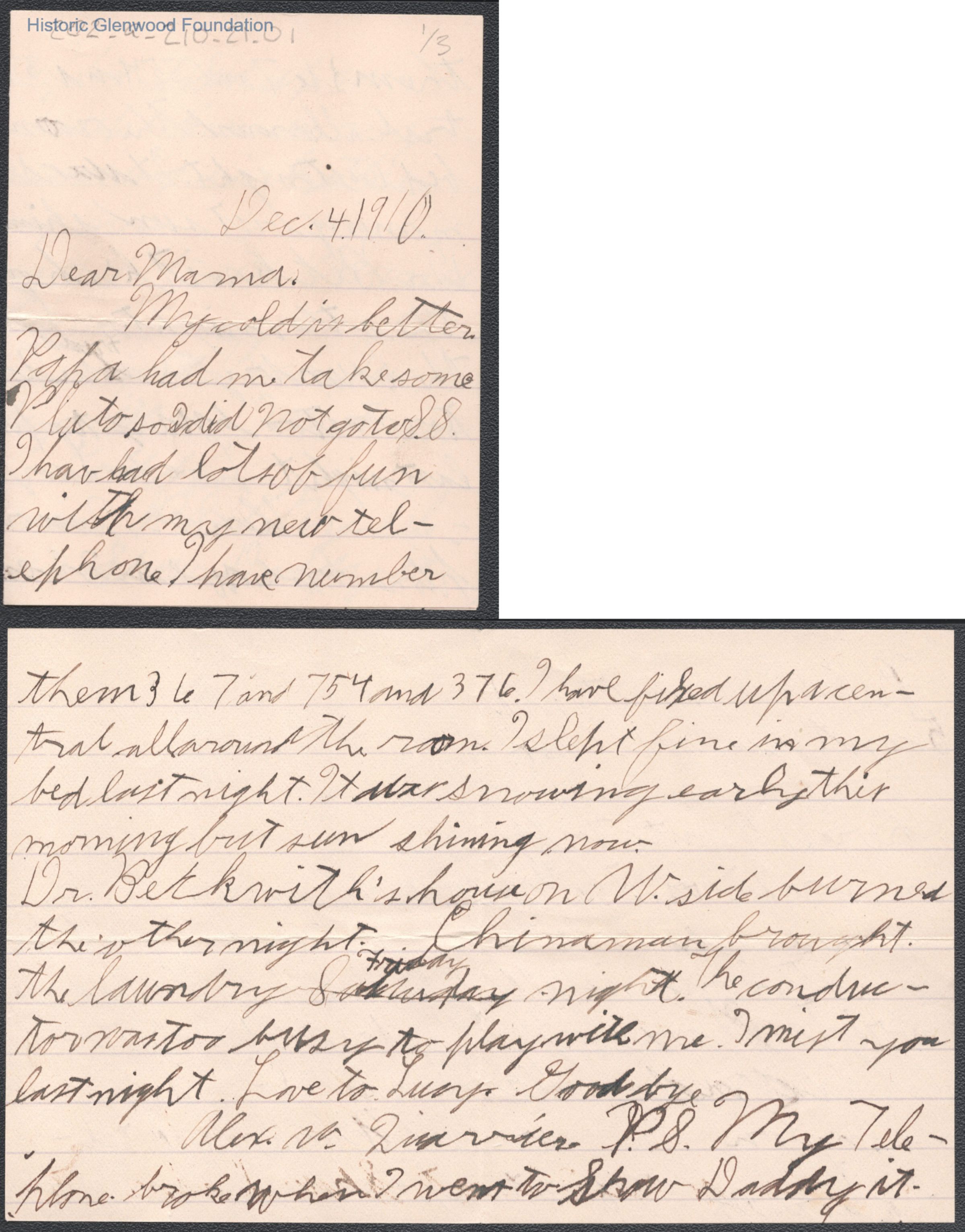 Three-page note to Elizabeth S. Quarrier from her son Alexander W. Quarrier, dated Dec 4, 1910.