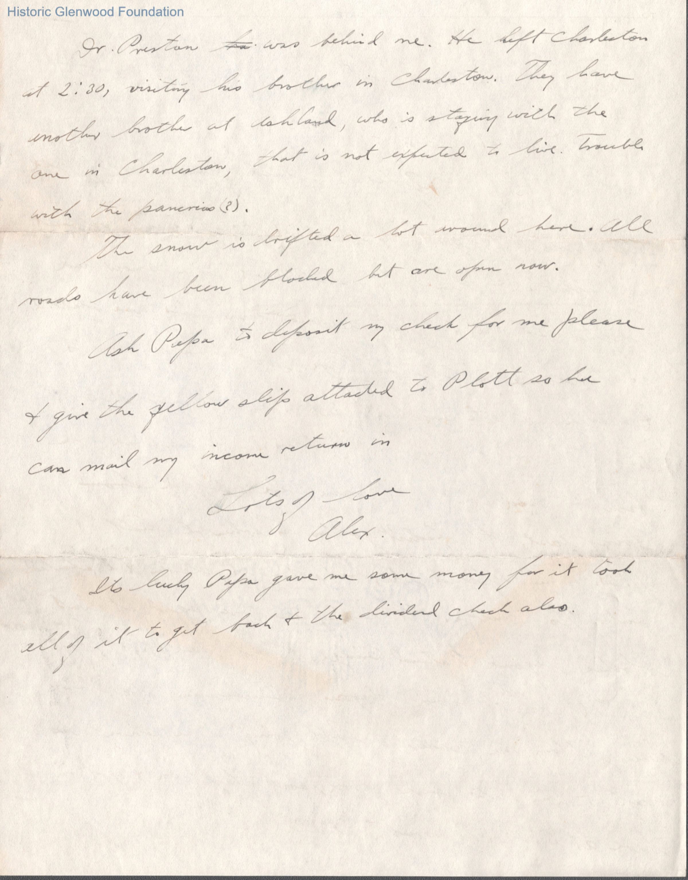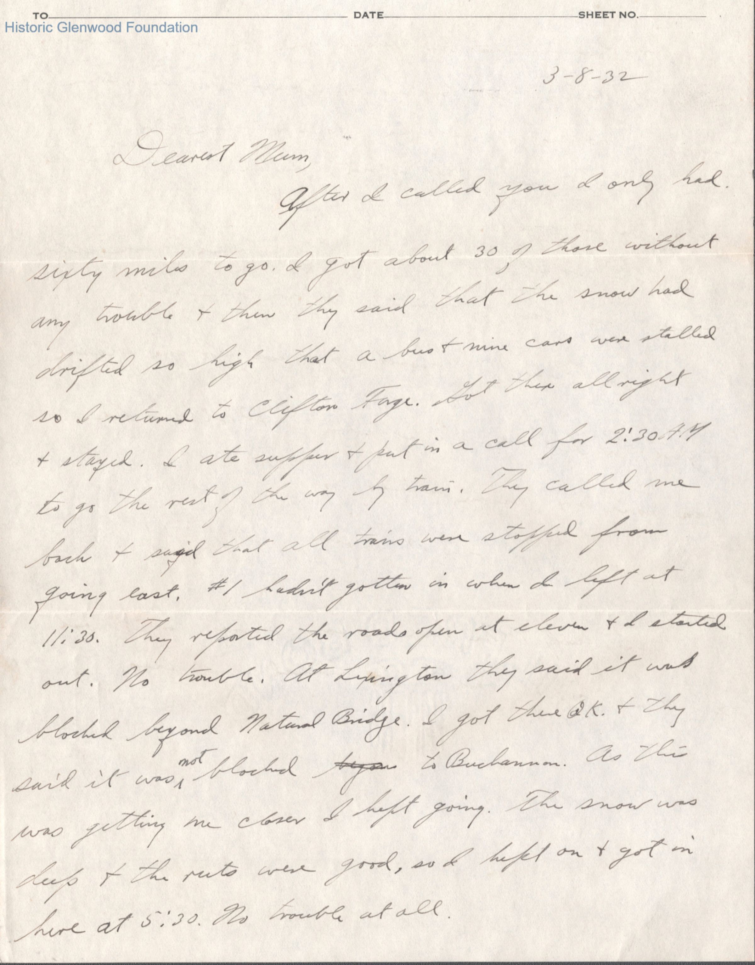 Two-page letter to Elizabeth S. Quarrier from her son Alexander W. Quarrier, Mar 8, 1932.