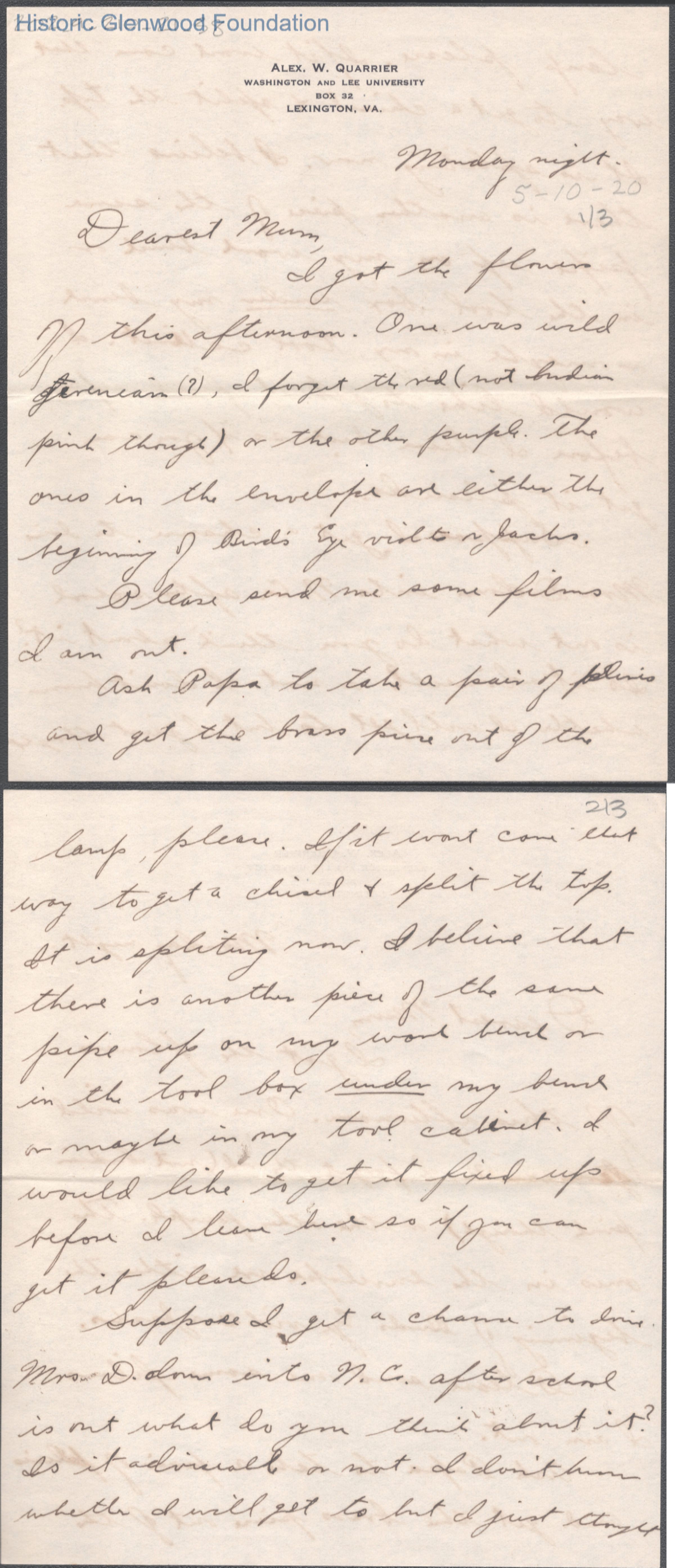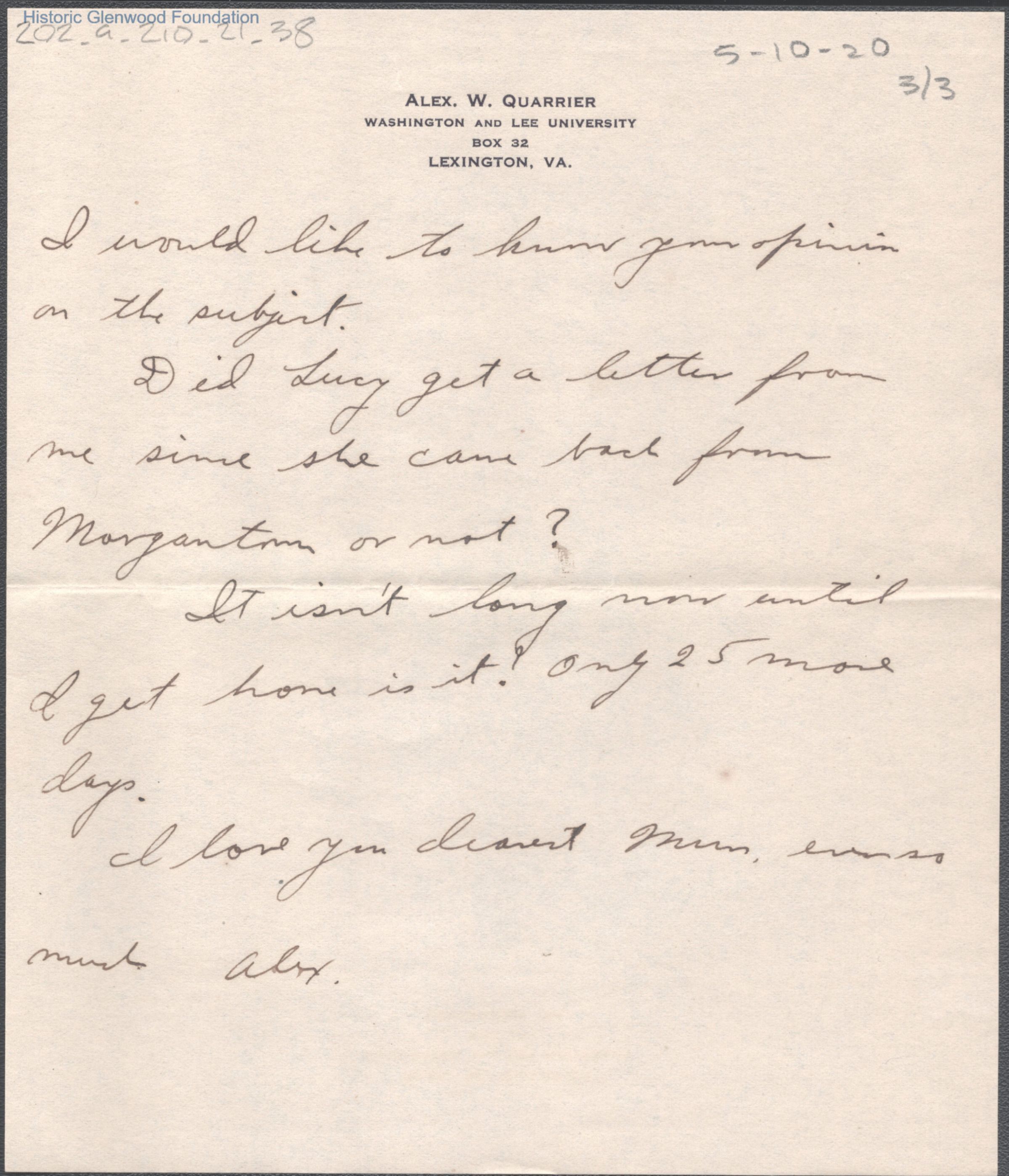 Three-page letter to Elizabeth S. Quarrier from her son Alexander W. Quarrier, dated May 10, 1920.