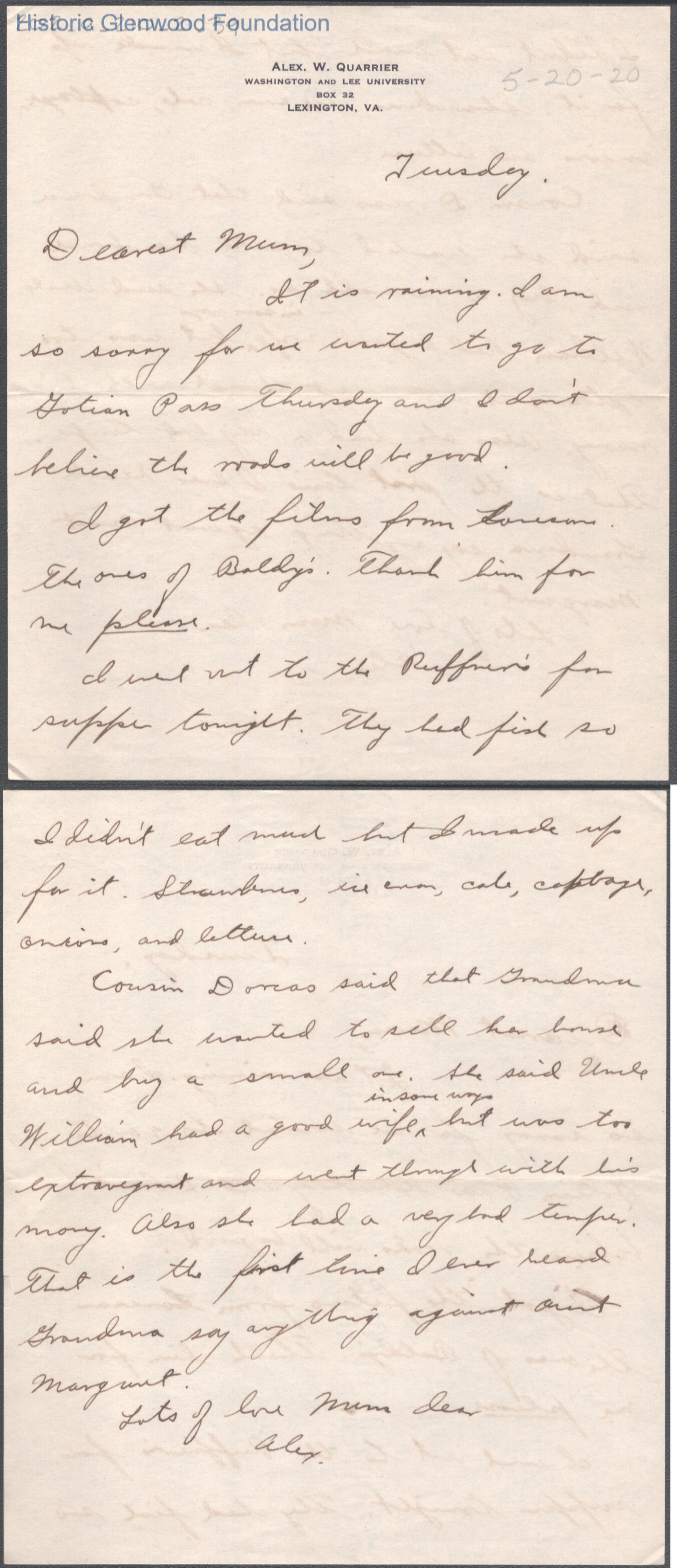 Two-page letter to Elizabeth S. Quarrier from her son Alexander W. Quarrier, dated May 20, 1920.