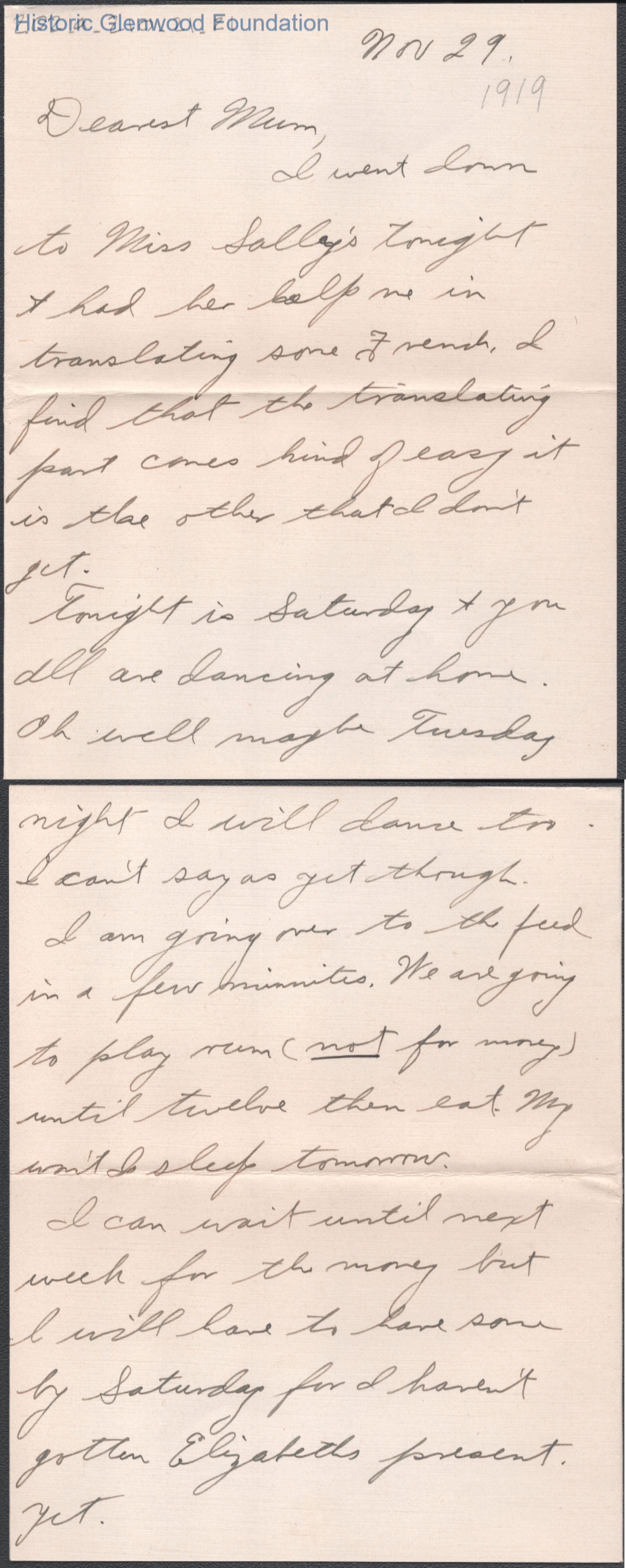 Three-page letter to Elizabeth S. Quarrier from her son Alexander W. Quarrier, dated Nov 29, 1919.