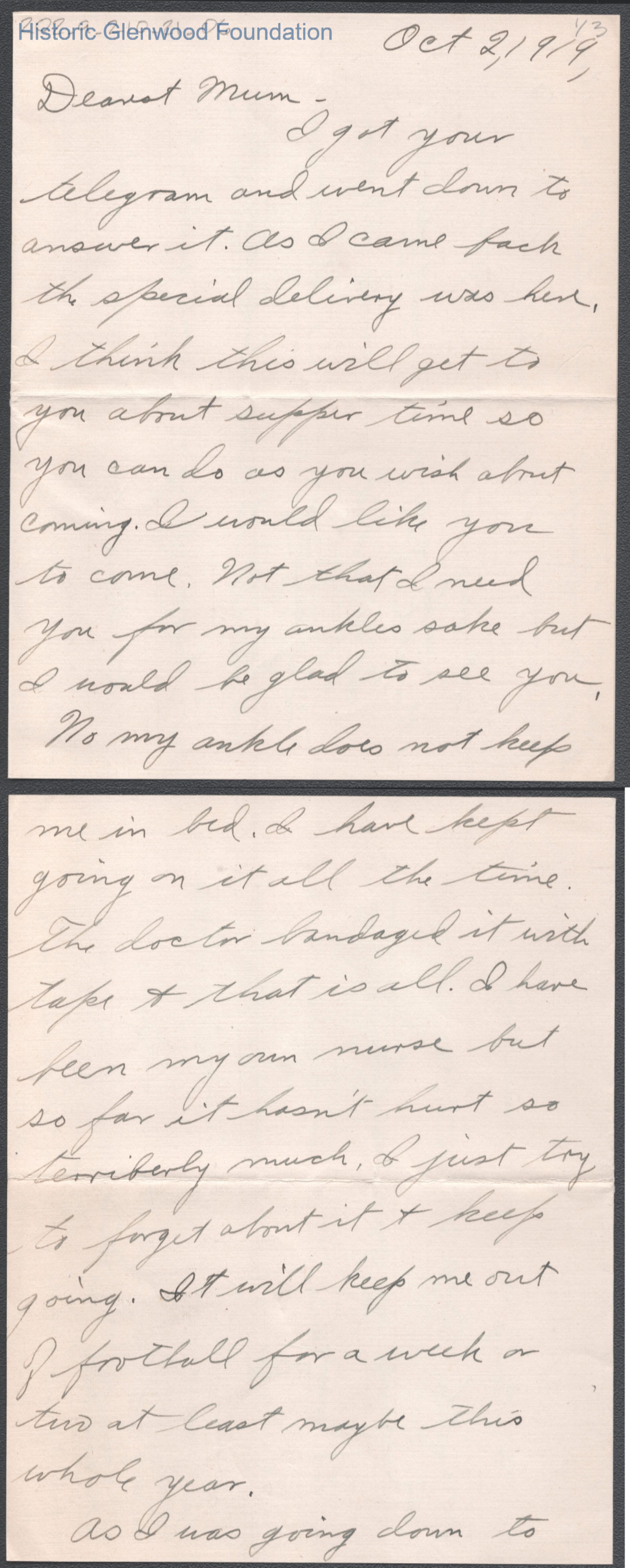 Three-page letter to Elizabeth S. Quarrier from her son Alexander W. Quarrier, dated Oct 2, 1919.