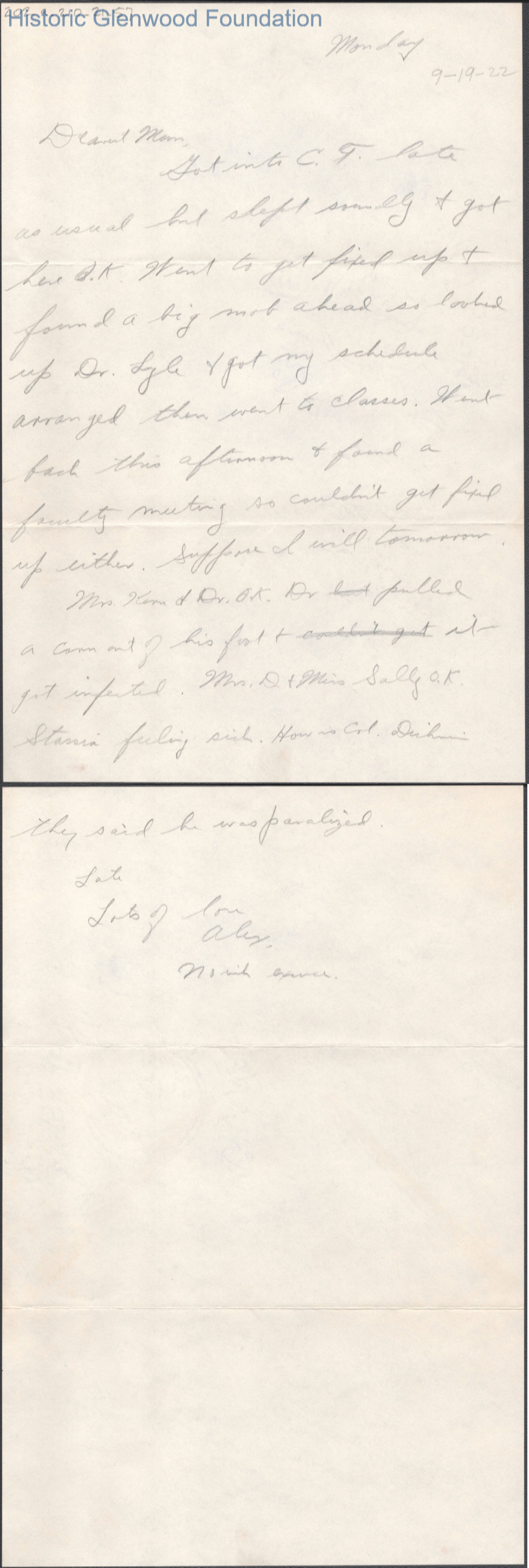 Two-page letter to Elizabeth S. Quarrier from her son Alexander W. Quarrier, Sep 19, 1922.