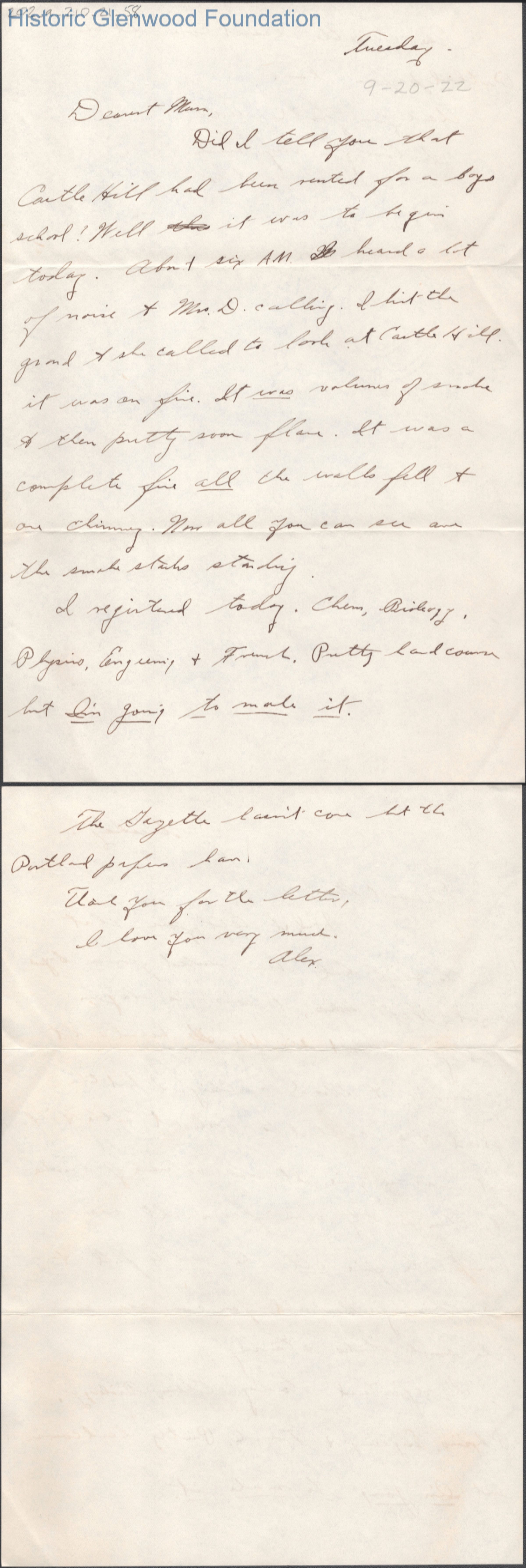 Two-page letter to Elizabeth S. Quarrier from her son Alexander W. Quarrier, Sep 20, 1922.