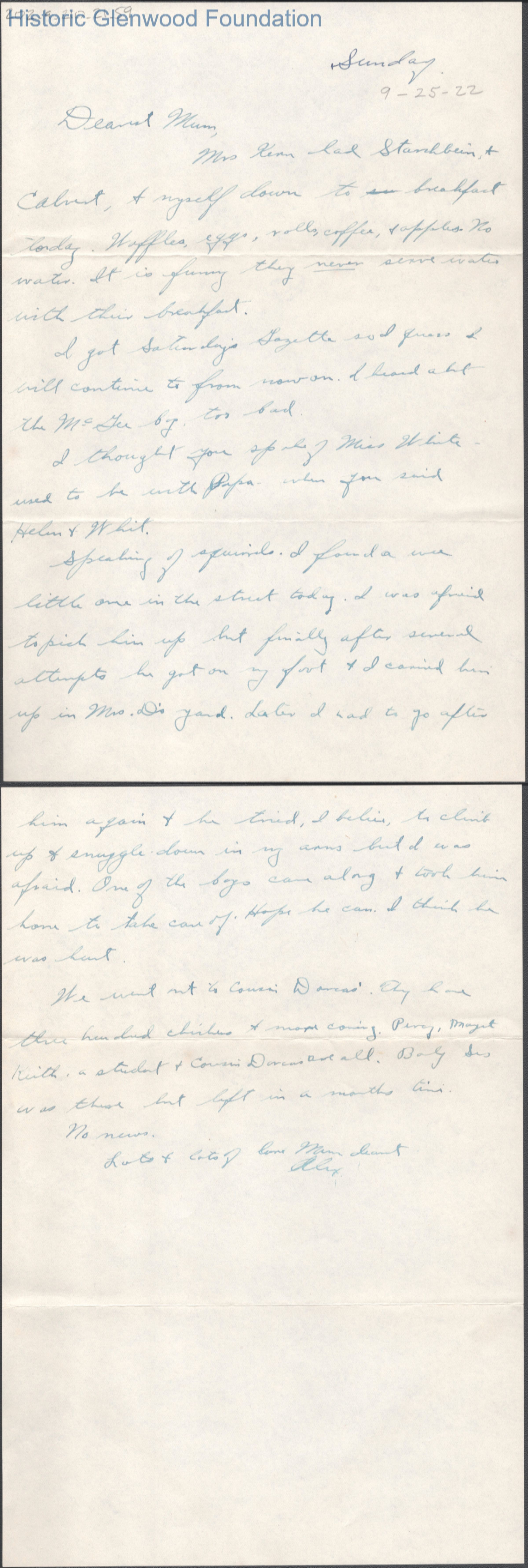 Two-page letter to Elizabeth S. Quarrier from her son Alexander W. Quarrier, Sep 25, 1922.