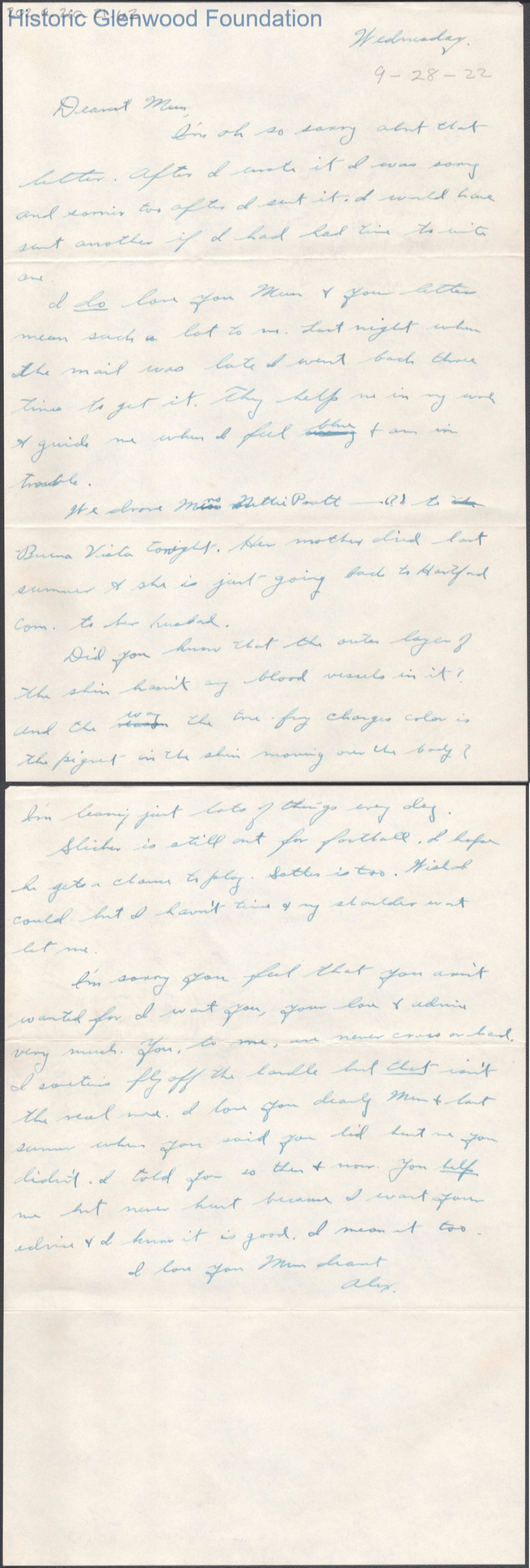 Two-page letter to Elizabeth S. Quarrier from her son Alexander W. Quarrier, Sep 28, 1922.