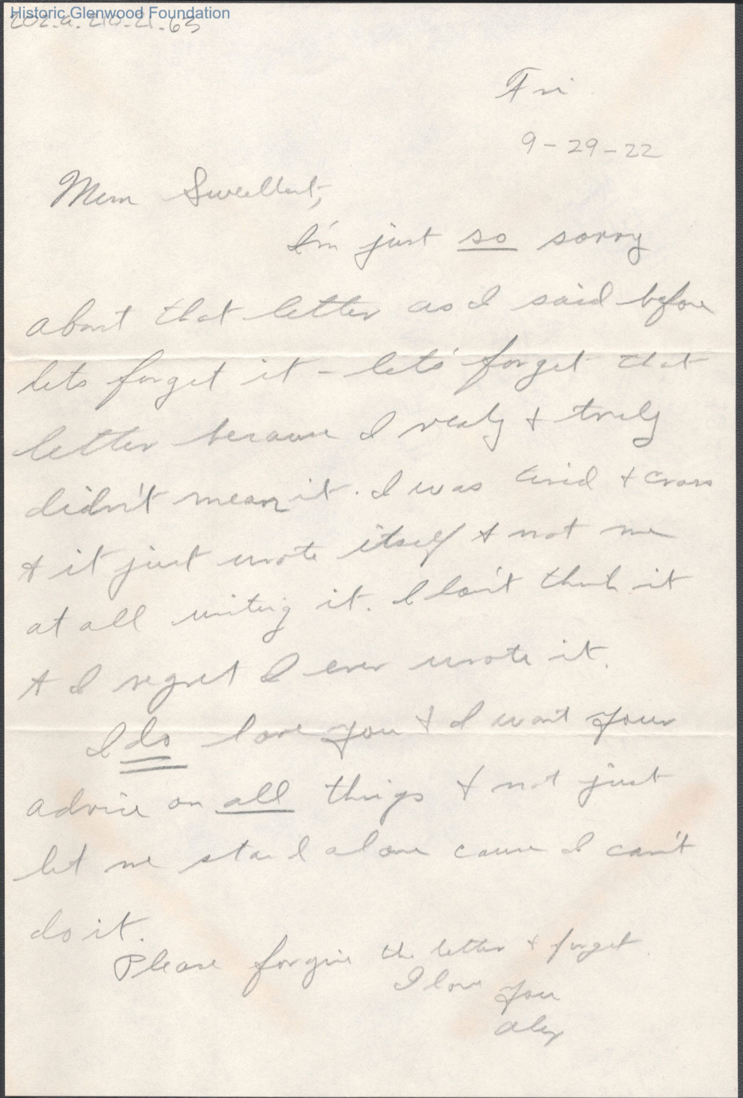 Single page letter to Elizabeth S. Quarrier from her son Alexander W. Quarrier, Sep 29, 1922.
