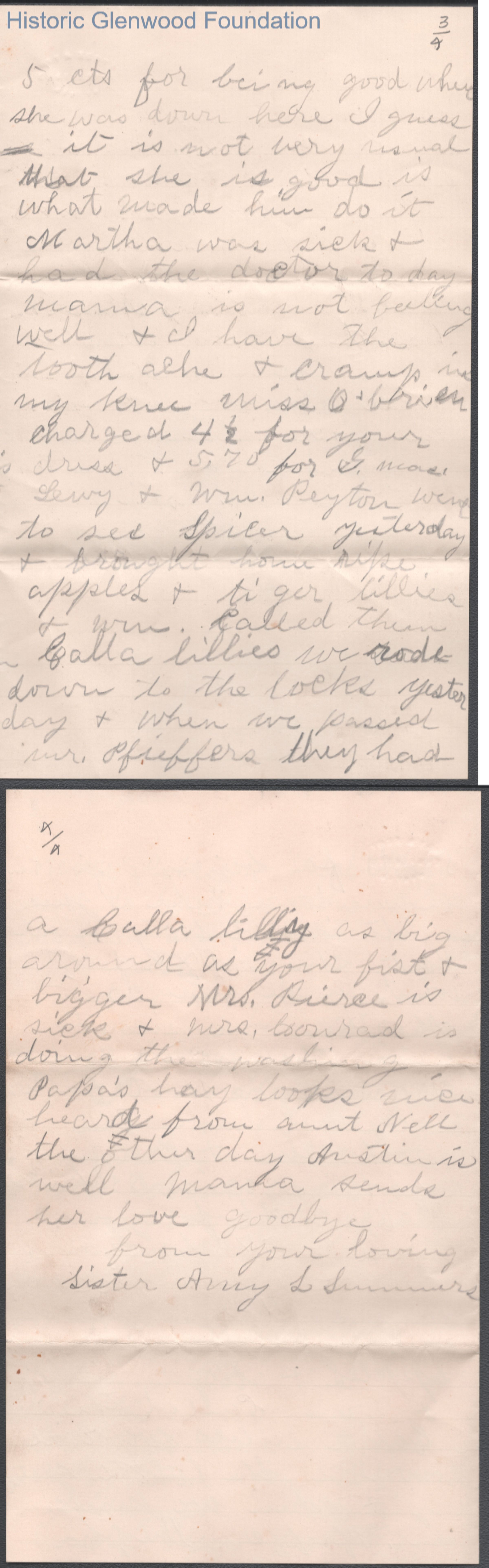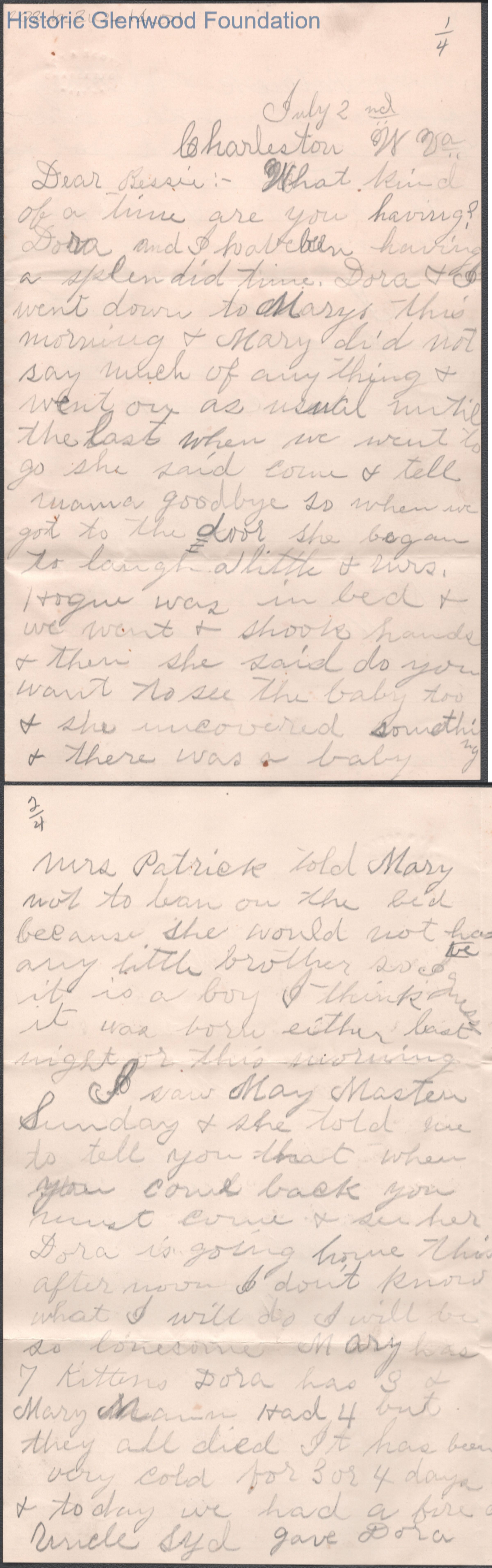 Four page letter to Elizabeth S. Quarrier from Amacetta Summers, unknown year though "July 2nd" is noted.Creator