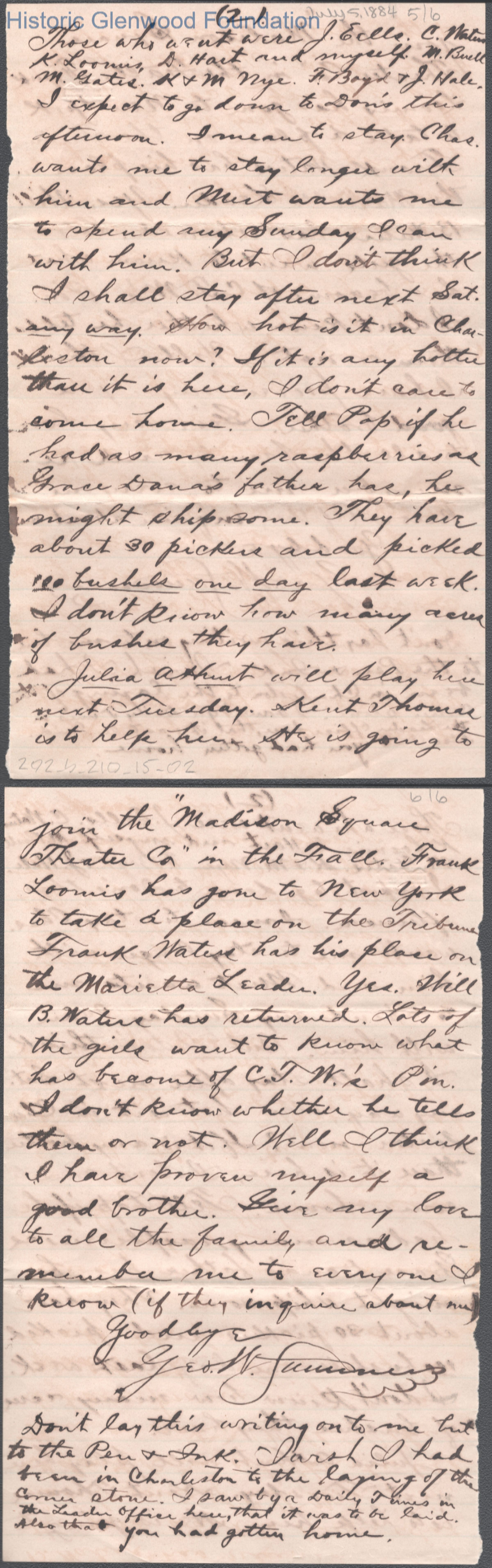Six-page letter to Elizabeth S. Quarrier from George W. Summers, Jul 5, 1884.