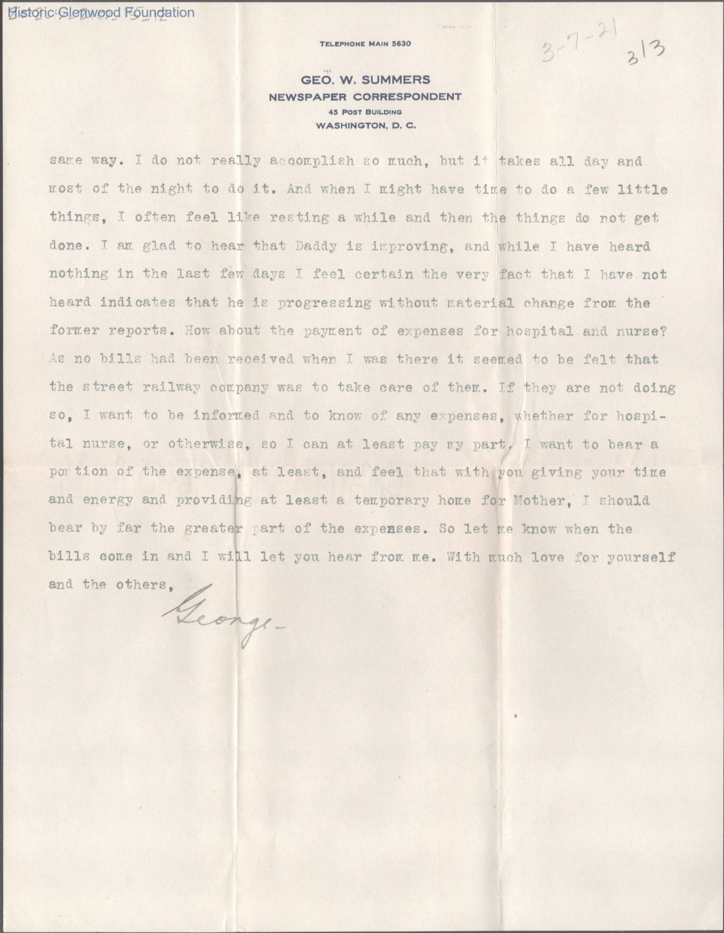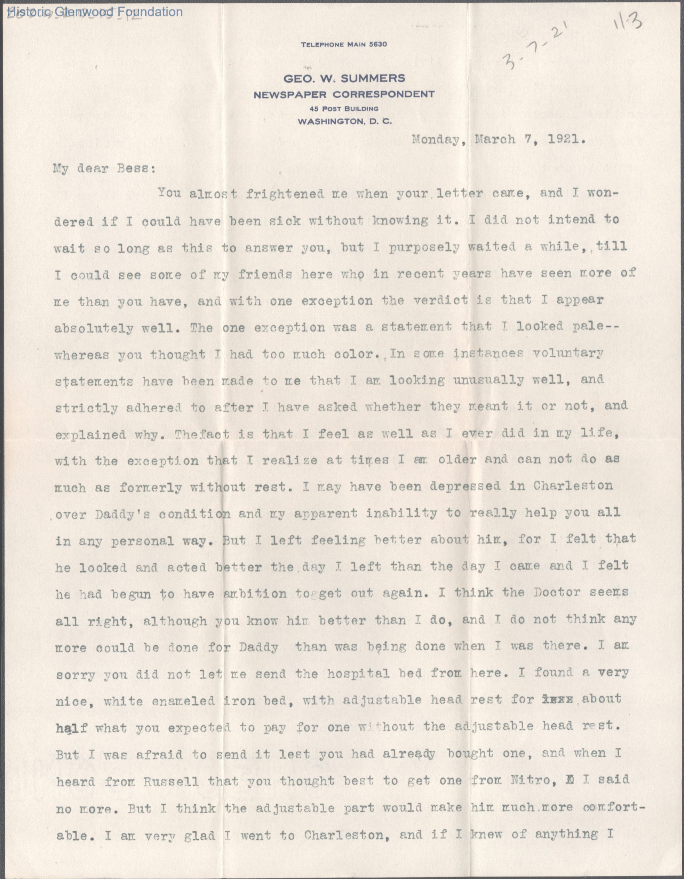 Elizabeth S. Quarrier from George W. Summers, Mar 7, 1921
