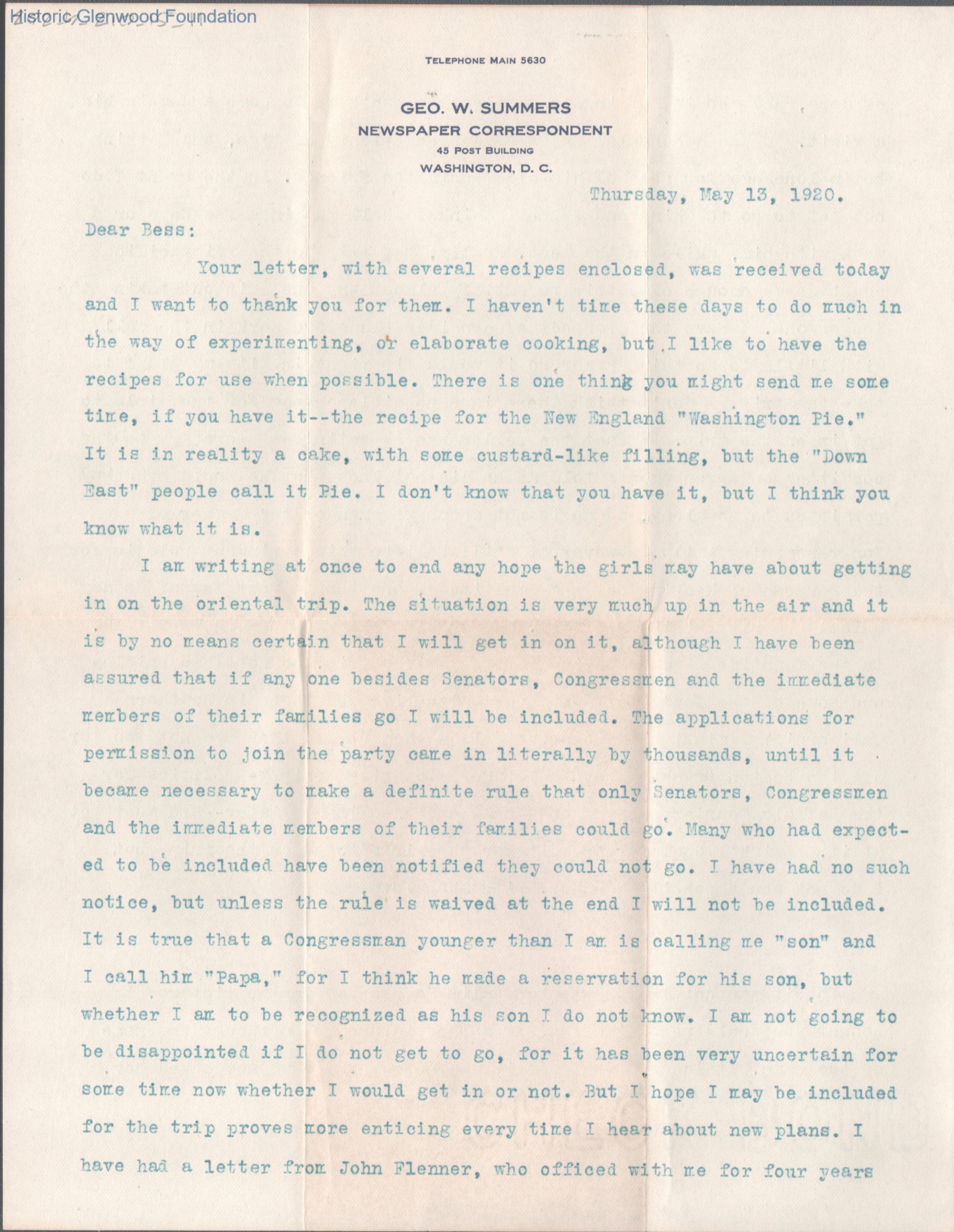 Two-page typed letter to Elizabeth S. Quarrier from George W. Summers, May 13, 1920.