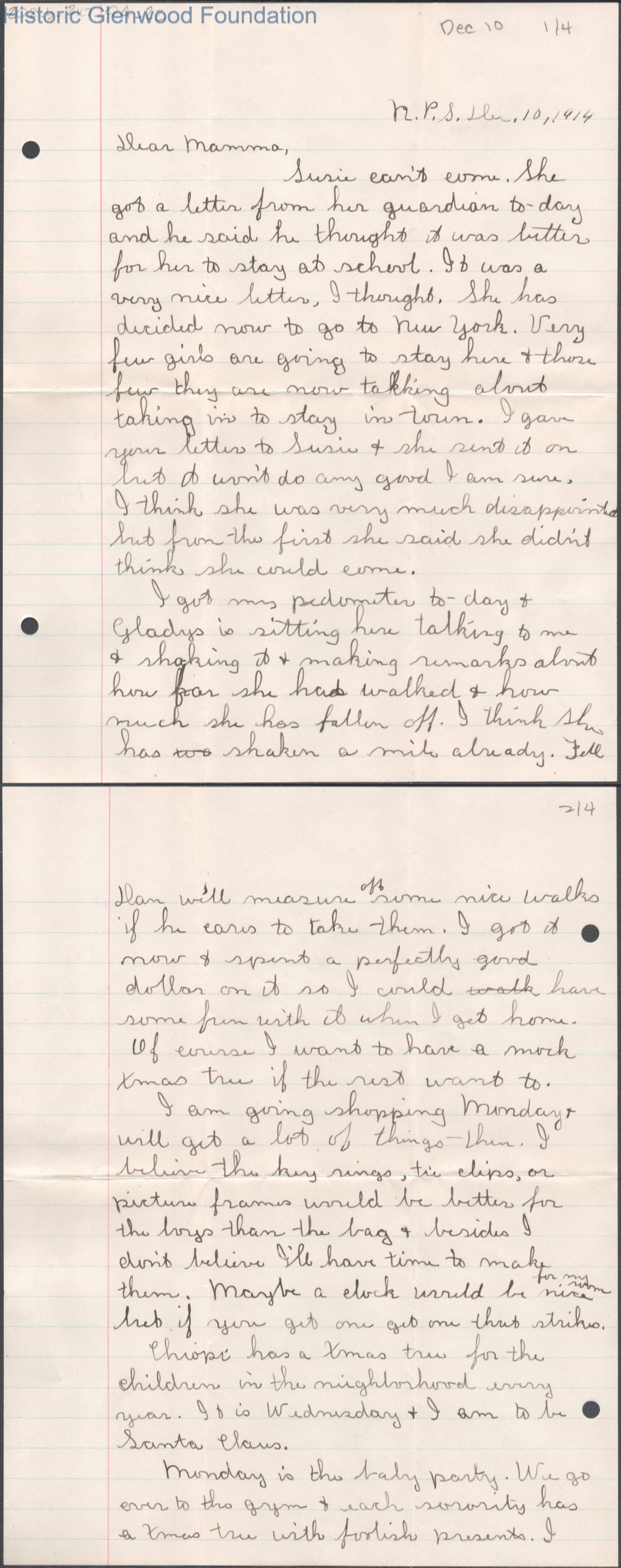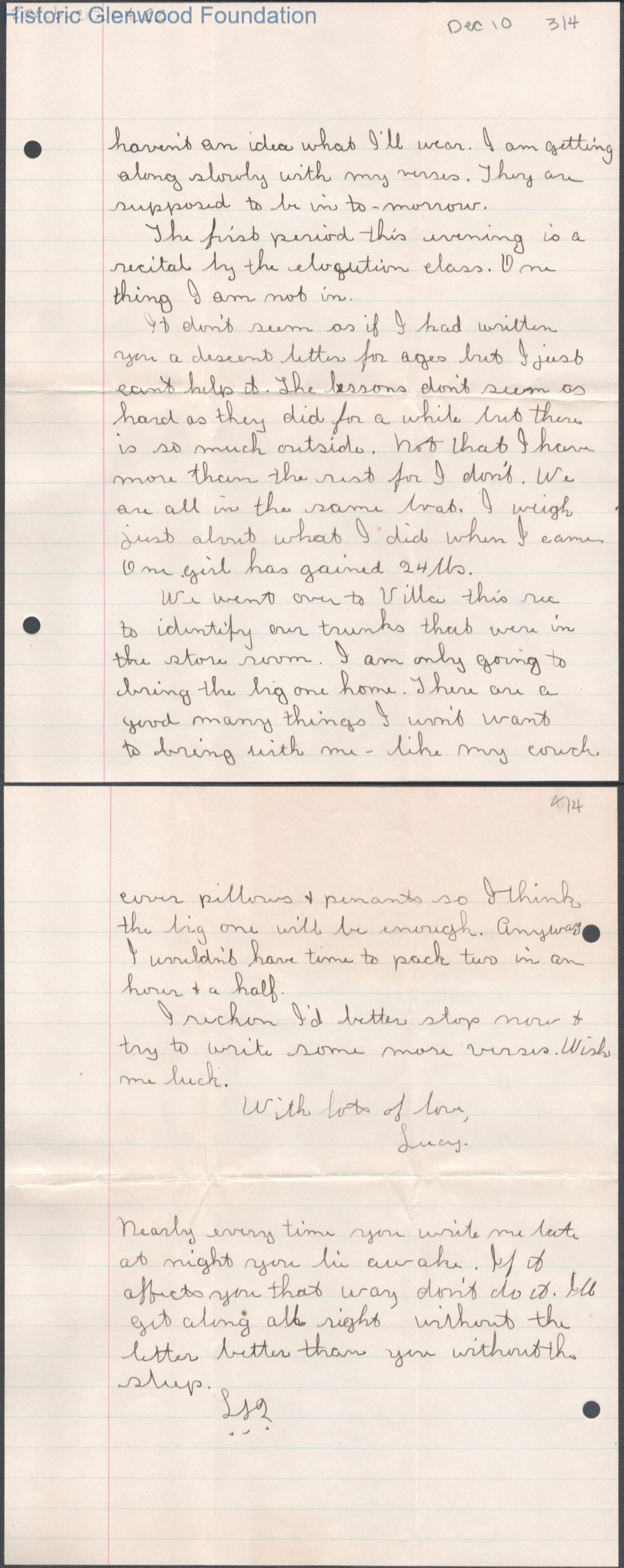 Four-page letter to Elizabeth S. Quarrier from Lucy S. Quarrier, Dec 10, 1914.
