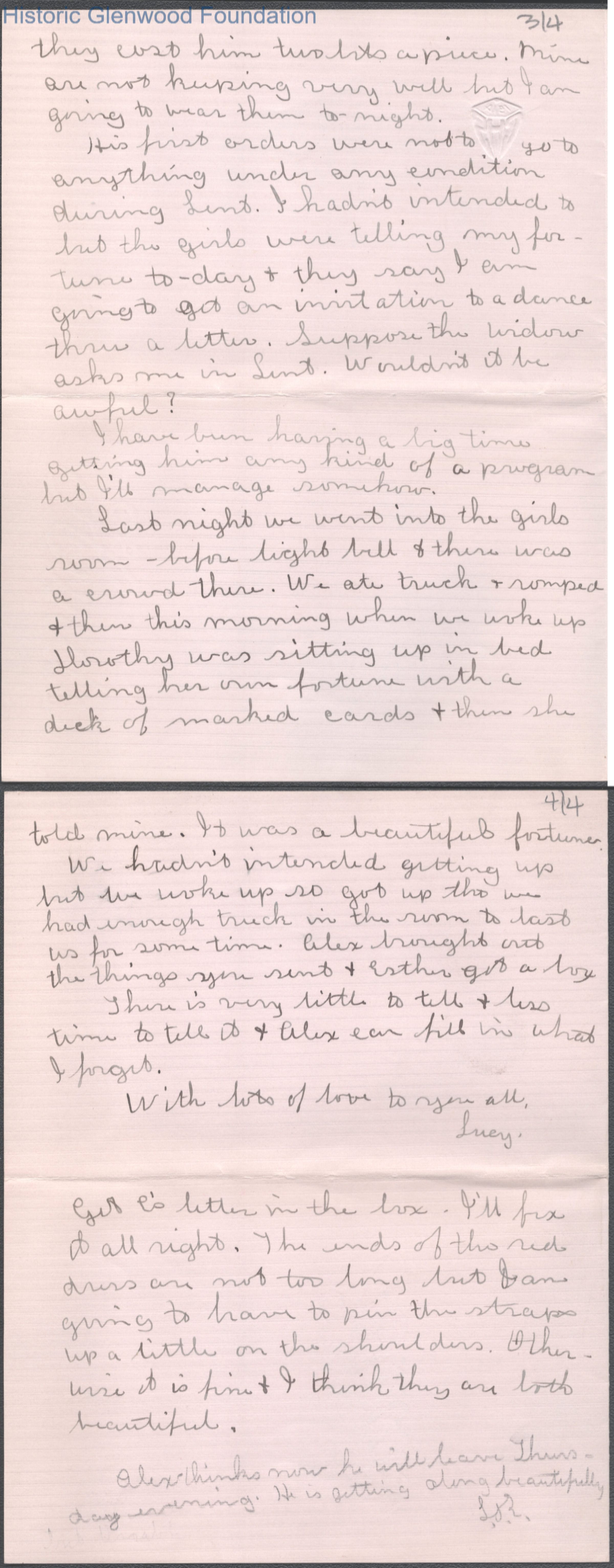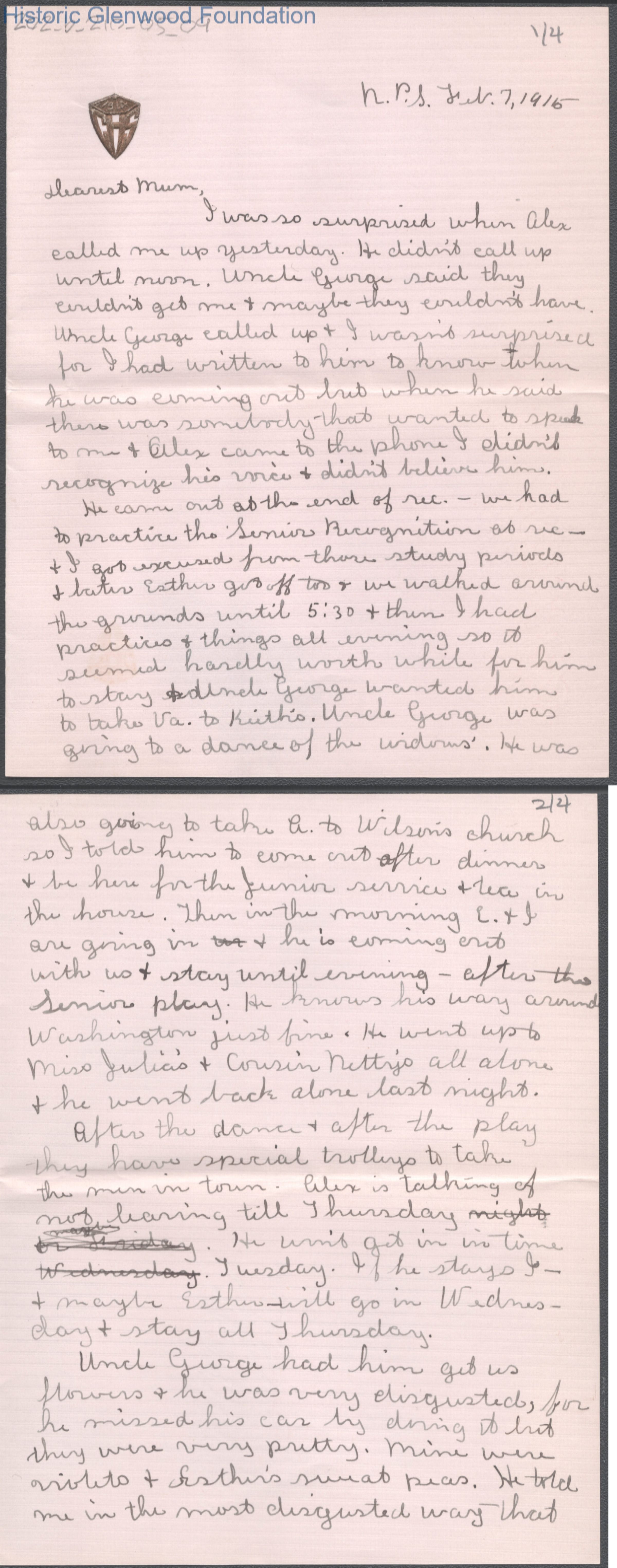 Four-page letter to Elizabeth S. Quarrier from Lucy S. Quarrier, Feb 7, 1915.