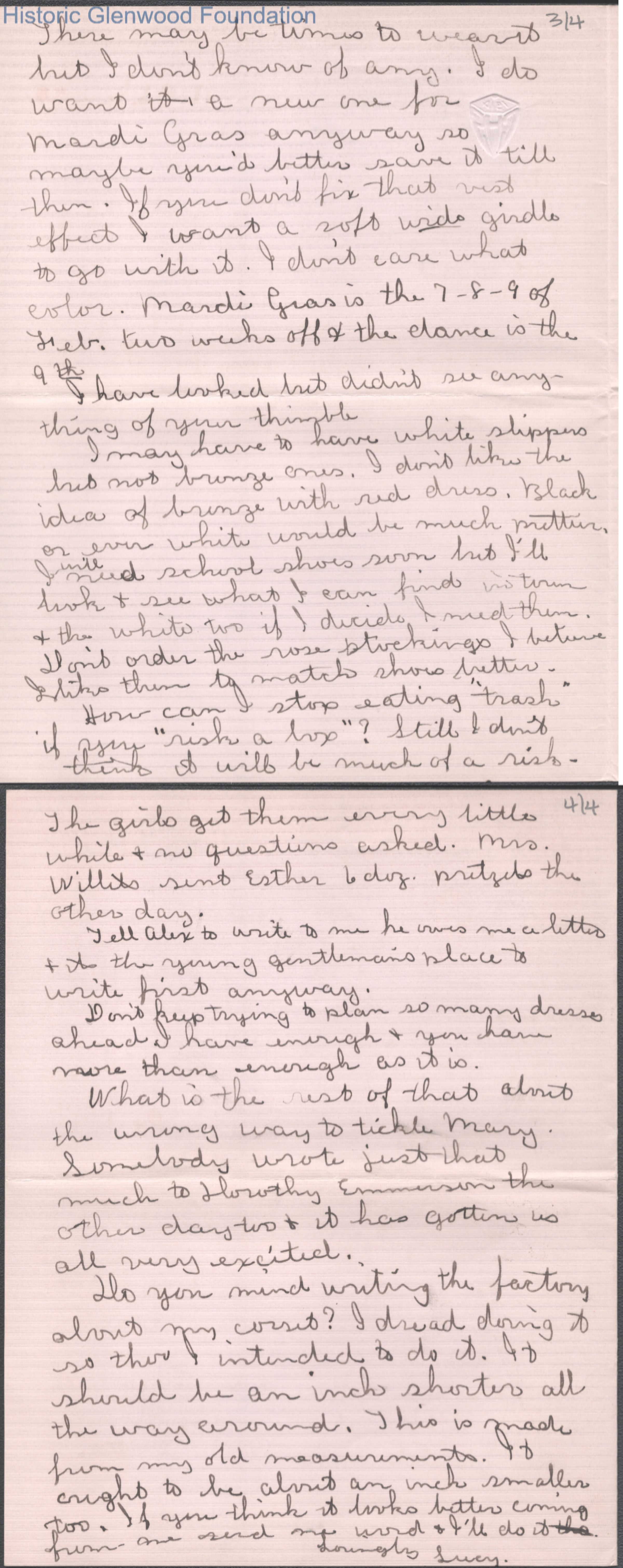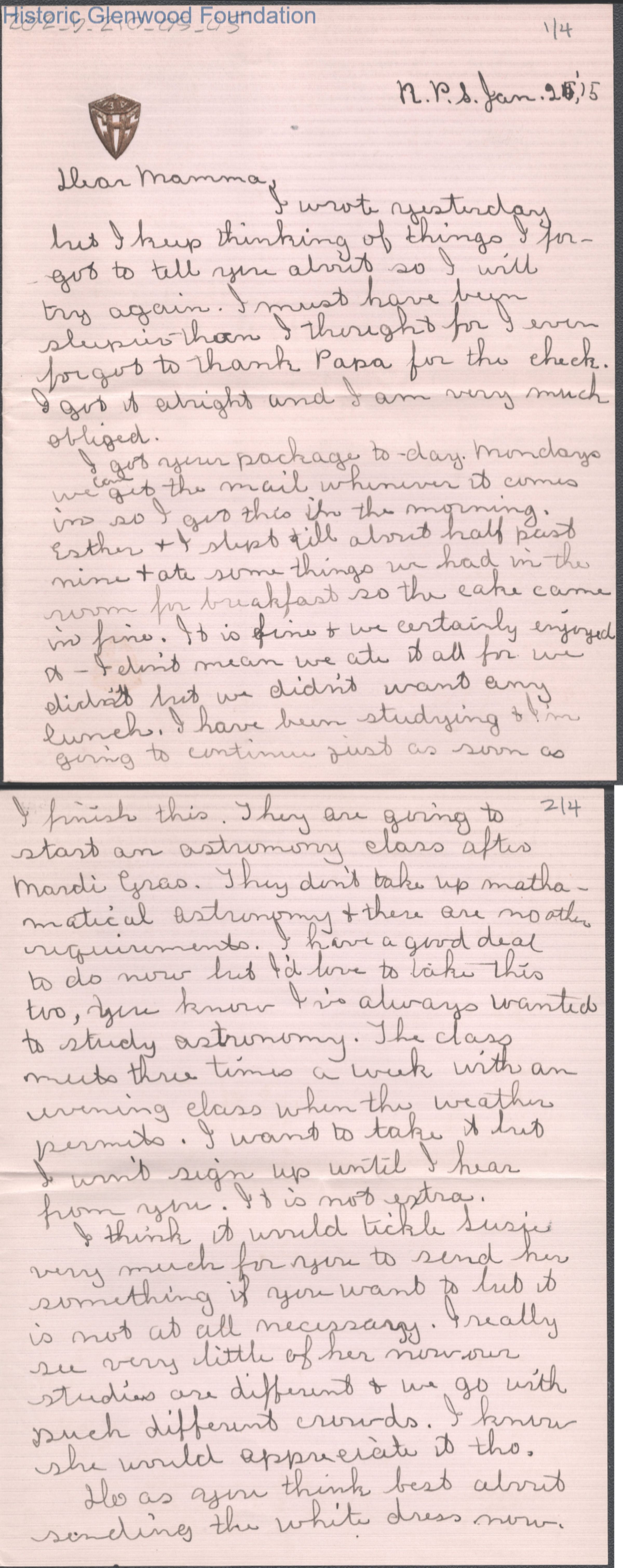 Four-page letter to Elizabeth S. Quarrier from Lucy S. Quarrier, Jan 25, 1915.