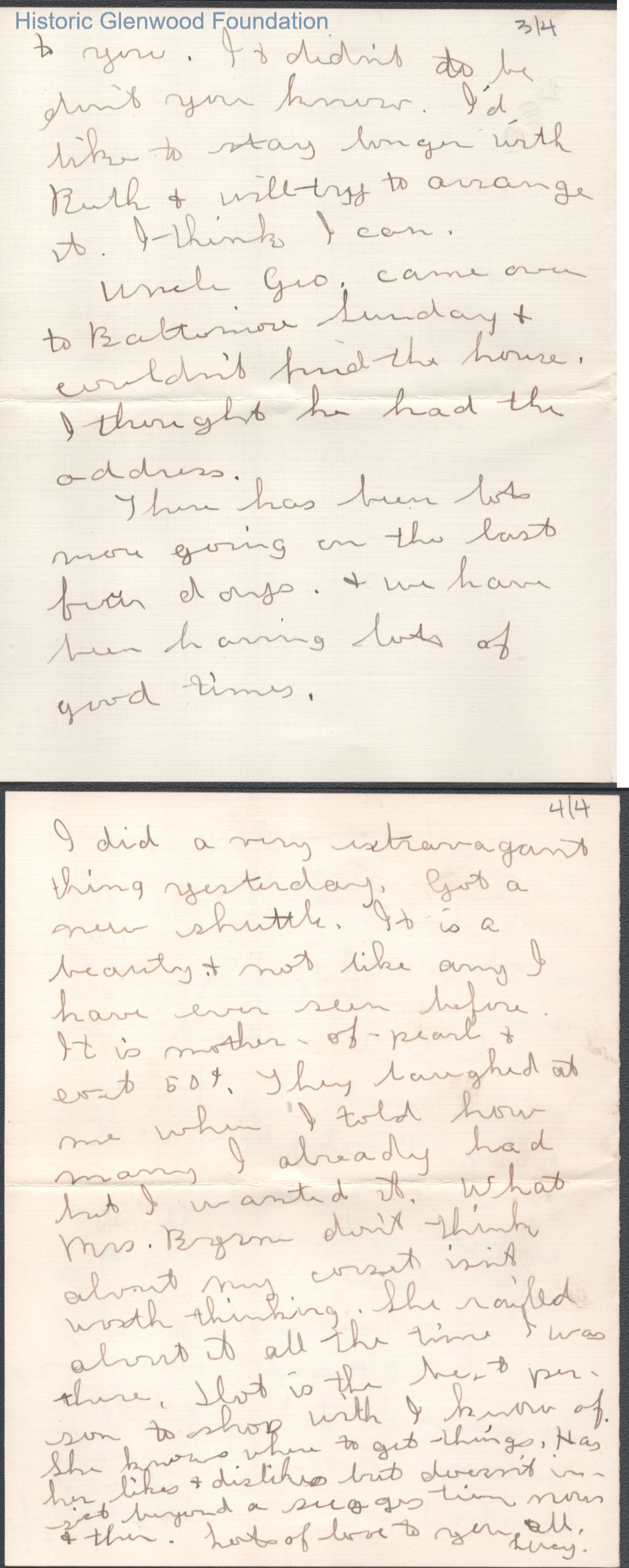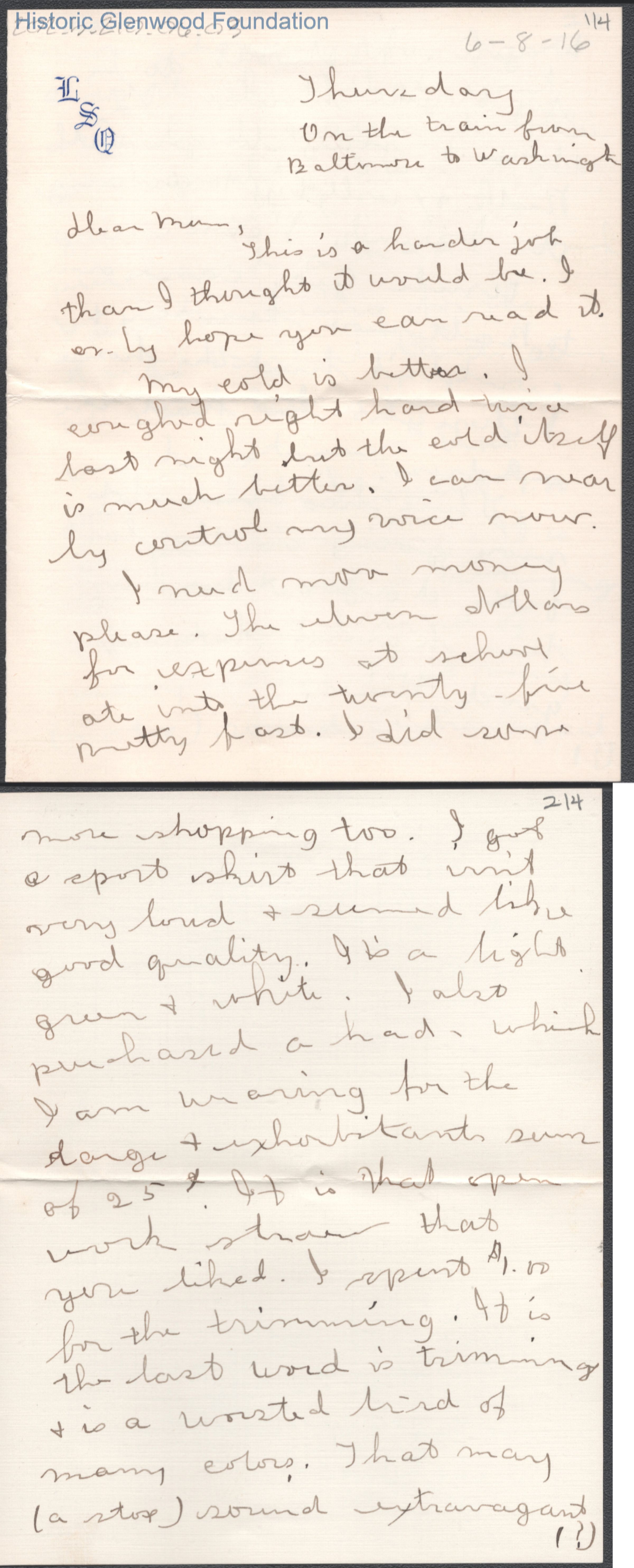Four-page letter to Elizabeth S. Quarrier from Lucy S. Quarrier, Jun 8, 1916.
