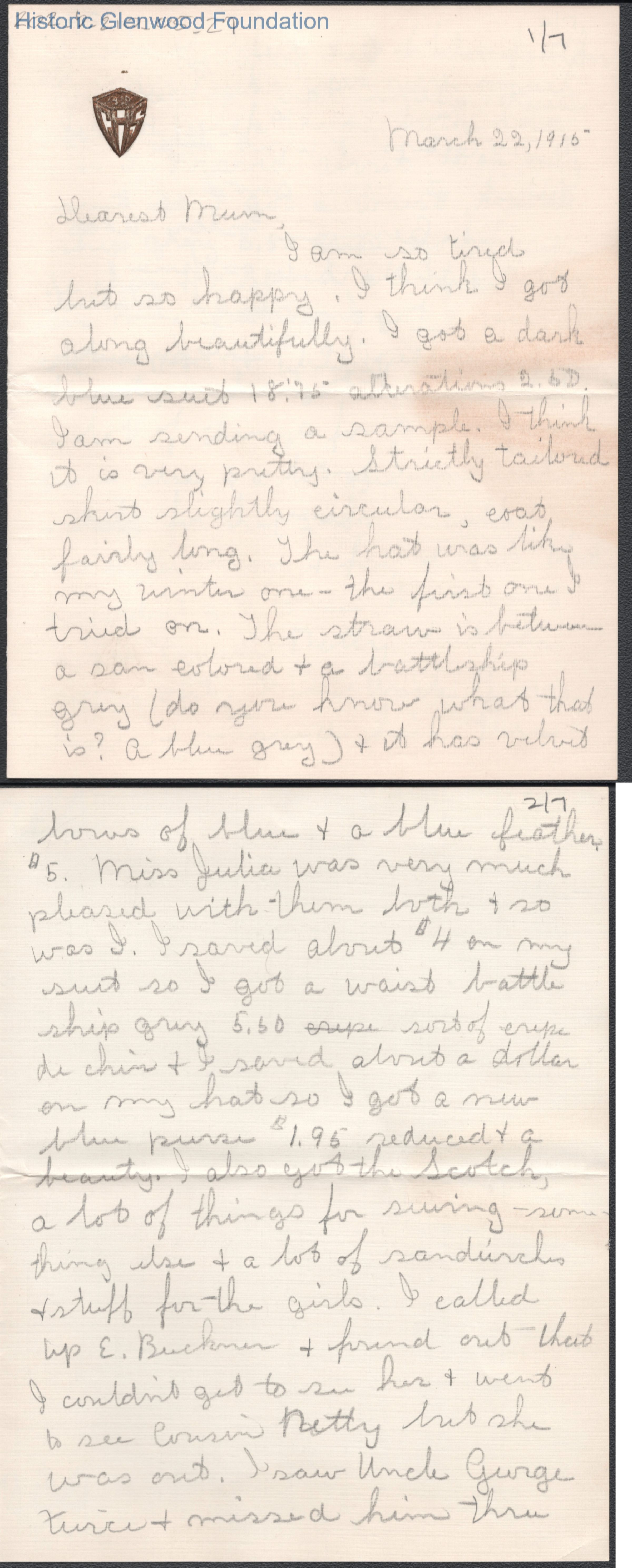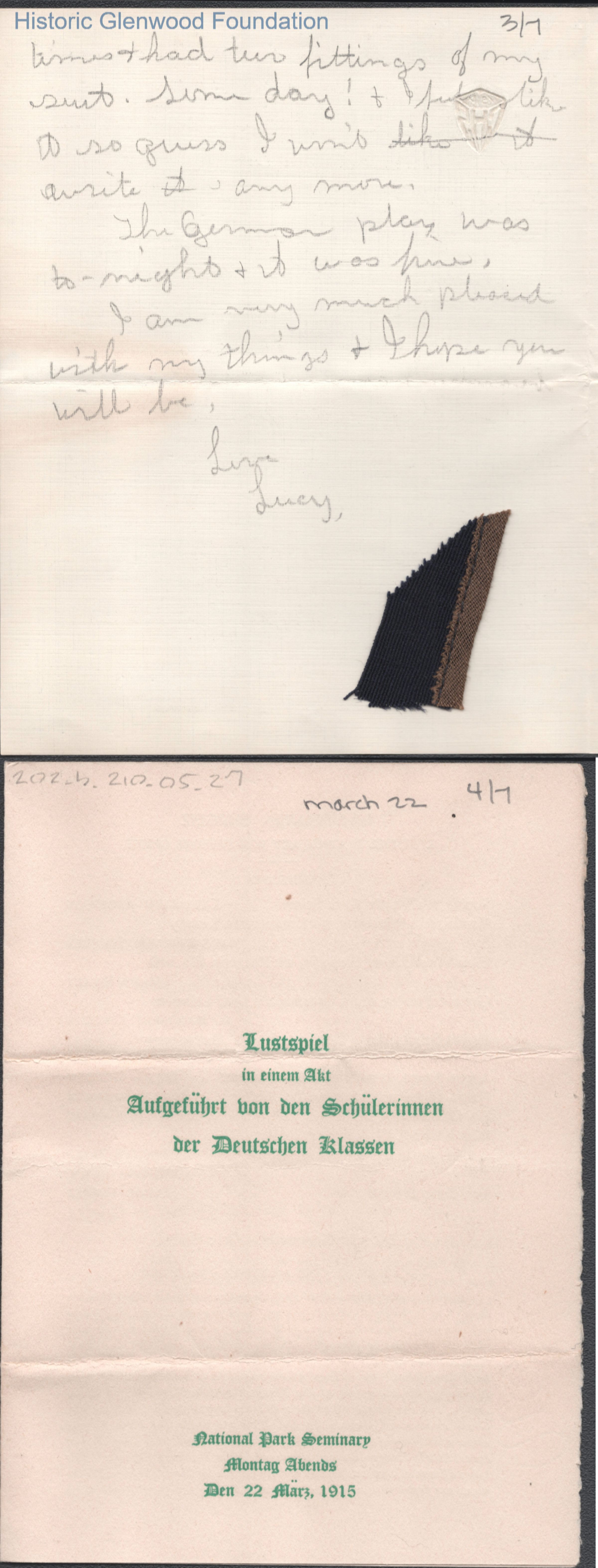 Three-page letter and enclosure to Elizabeth S. Quarrier from Lucy S. Quarrier, Mar 22, 1915.