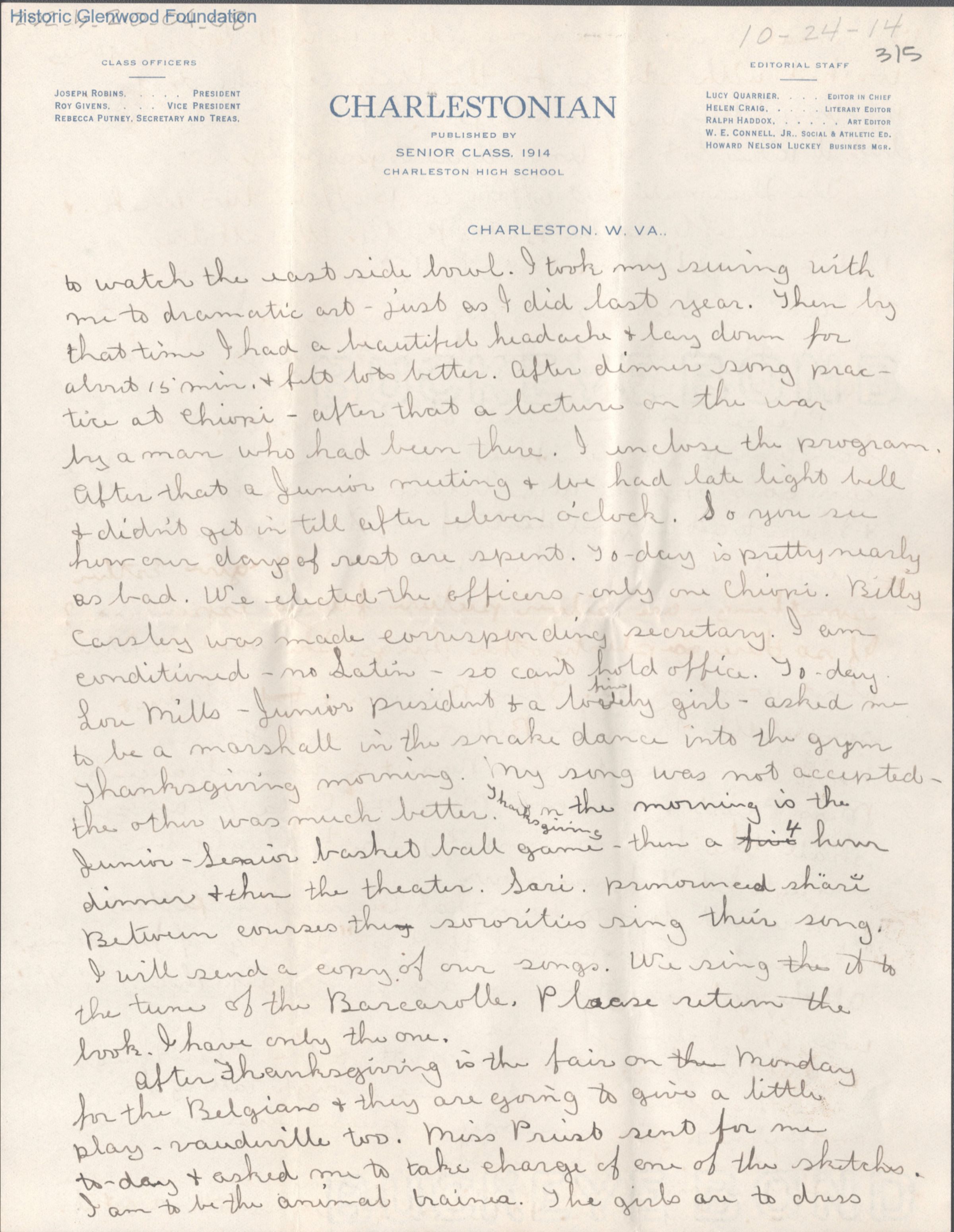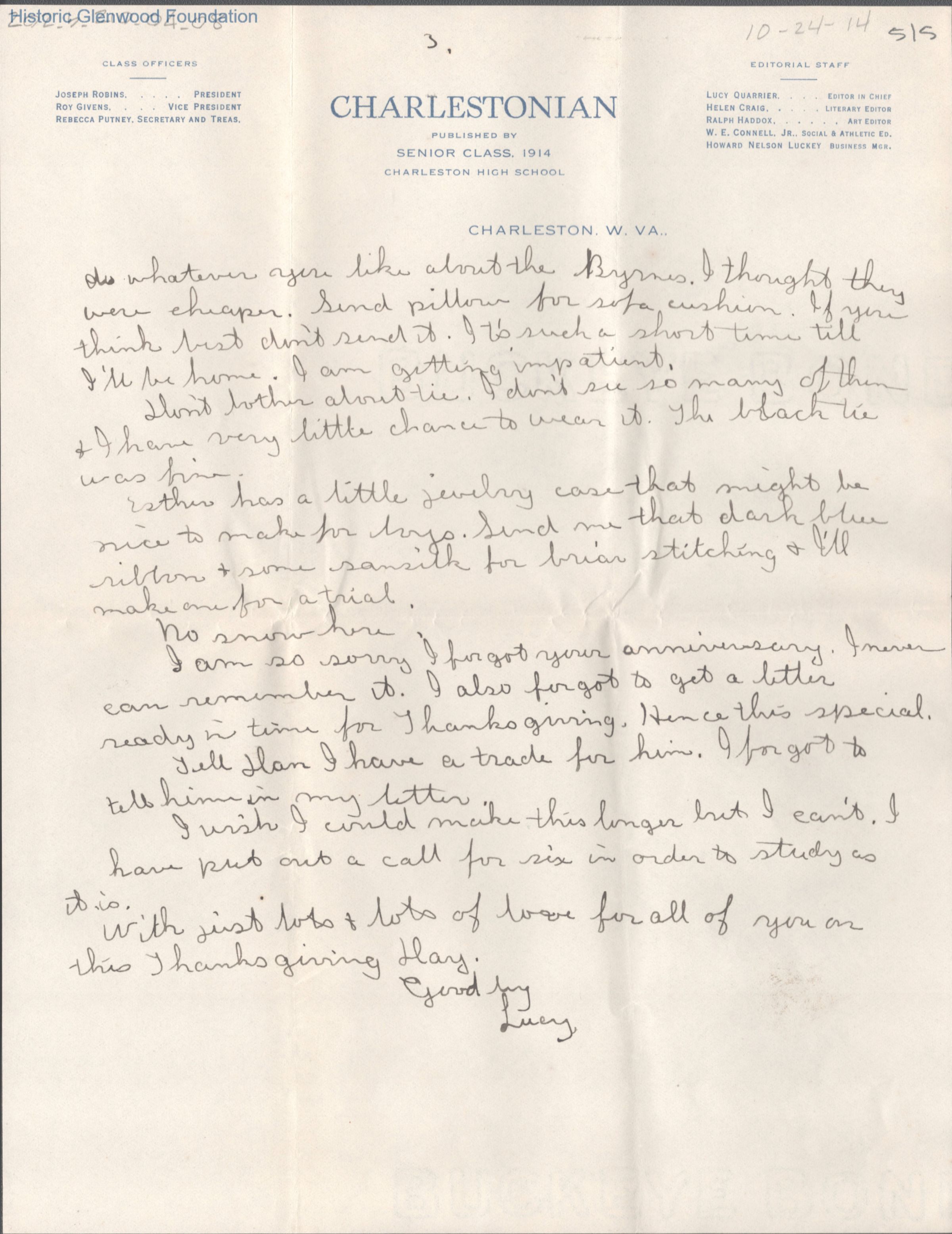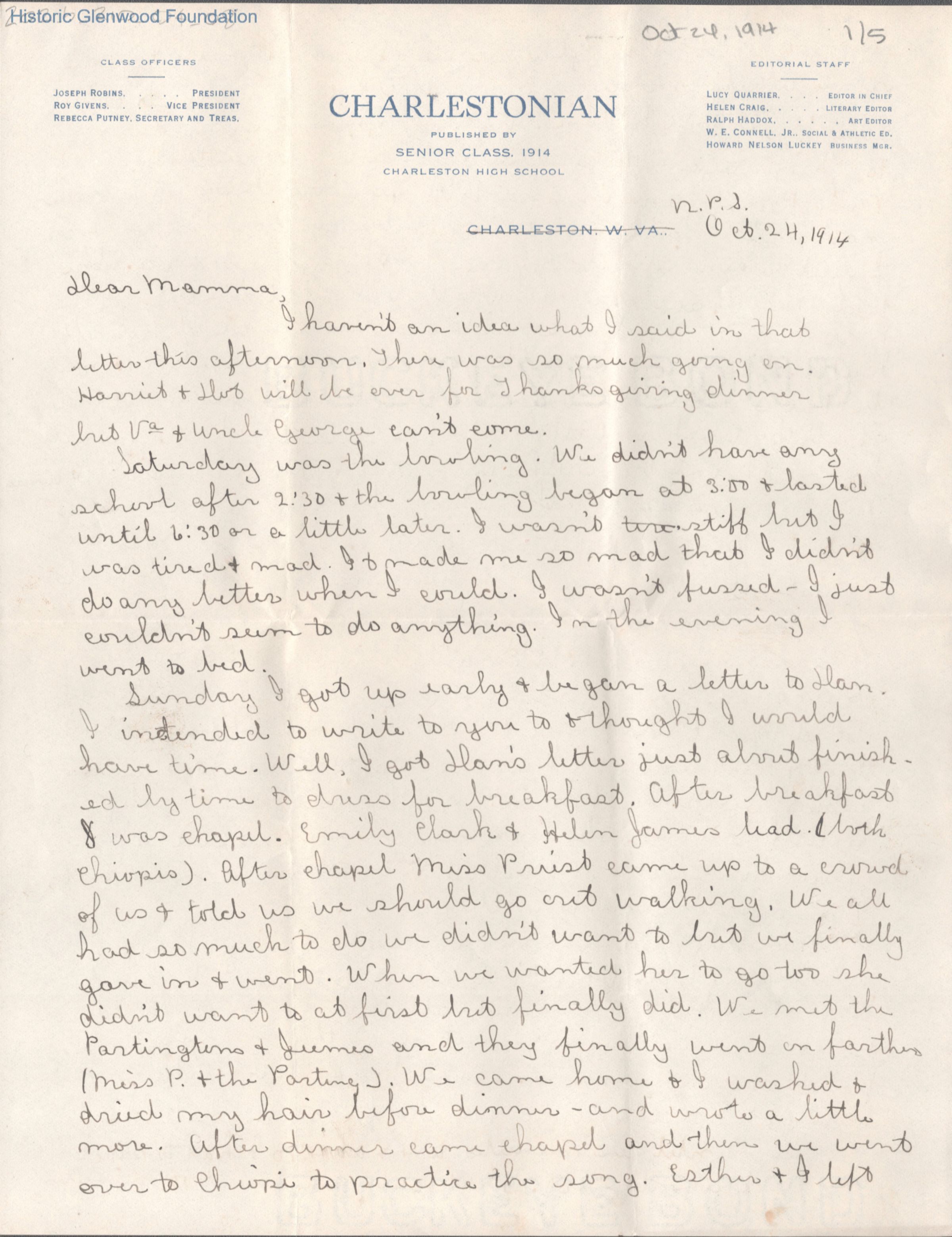 Elizabeth S. Quarrier from Lucy S. Quarrier, Oct 24, 1914