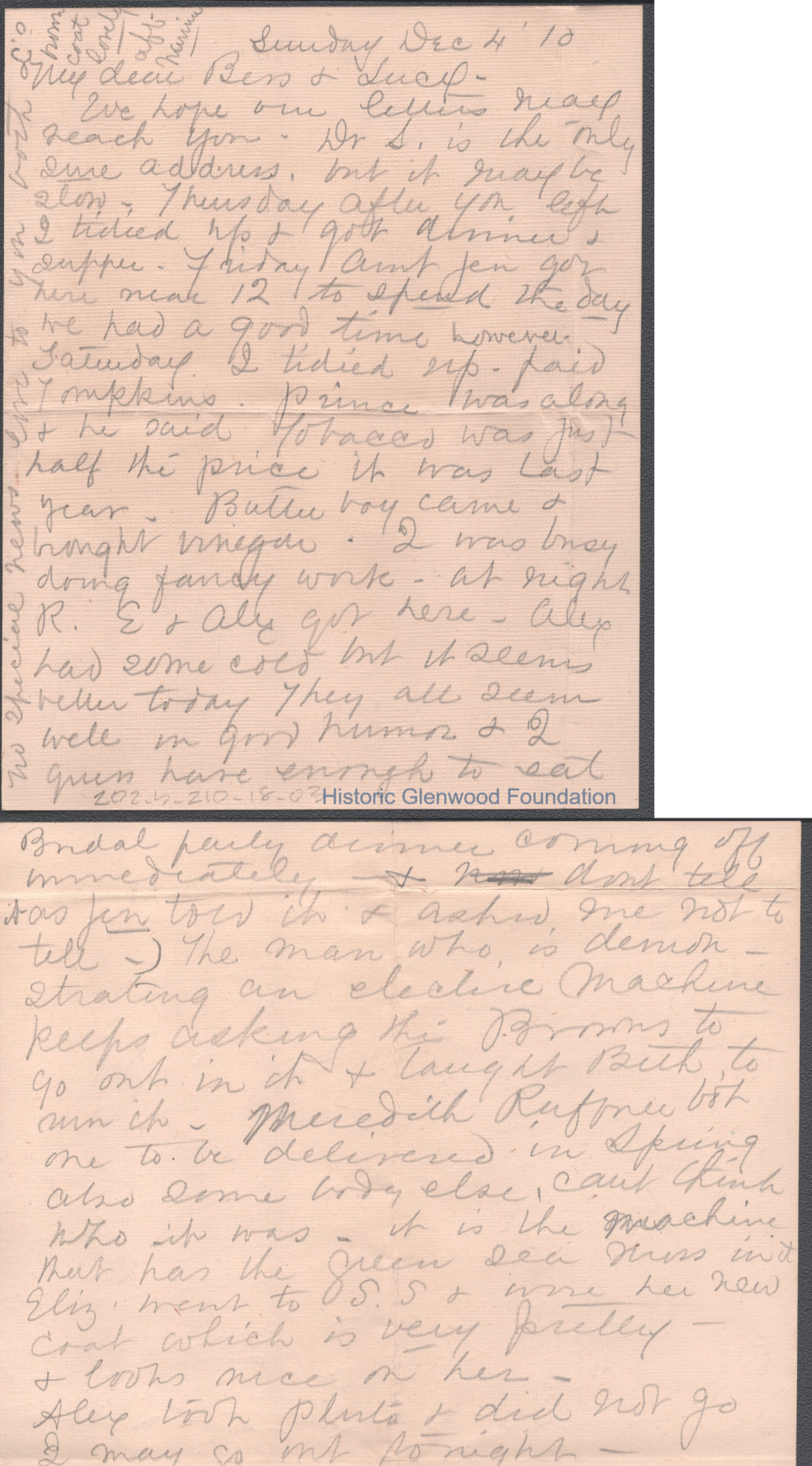 Four-page letter to Elizabeth S. Quarrier from mother Lucy W. Summers, Dec 4, 1910.