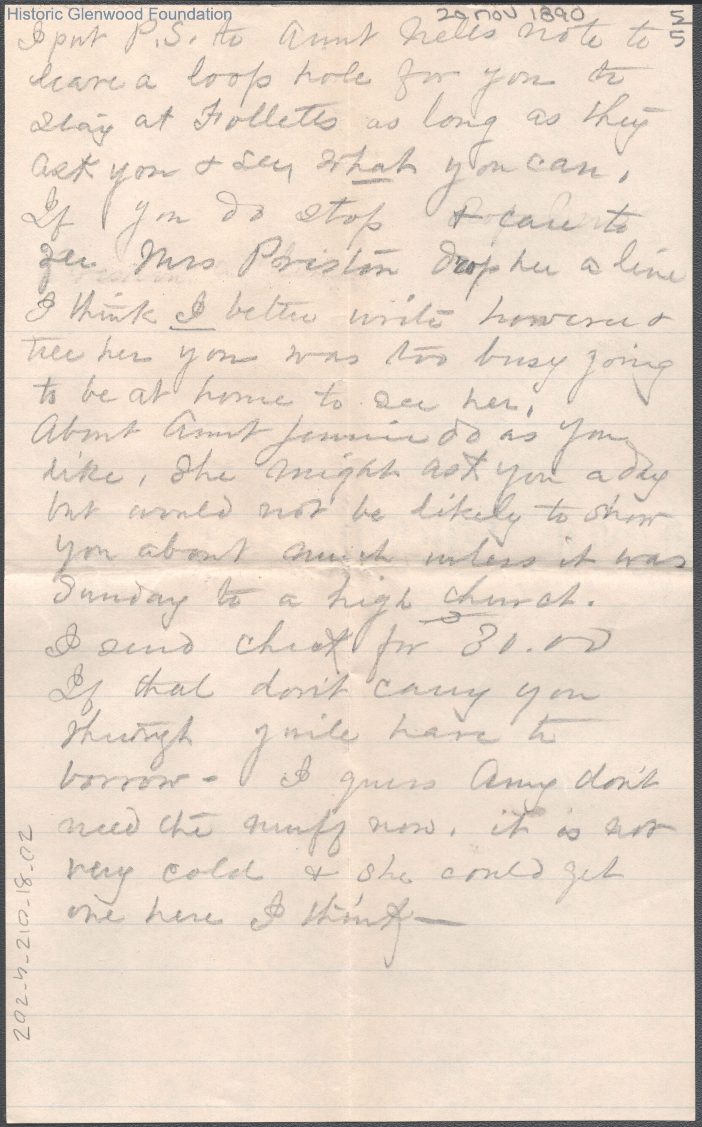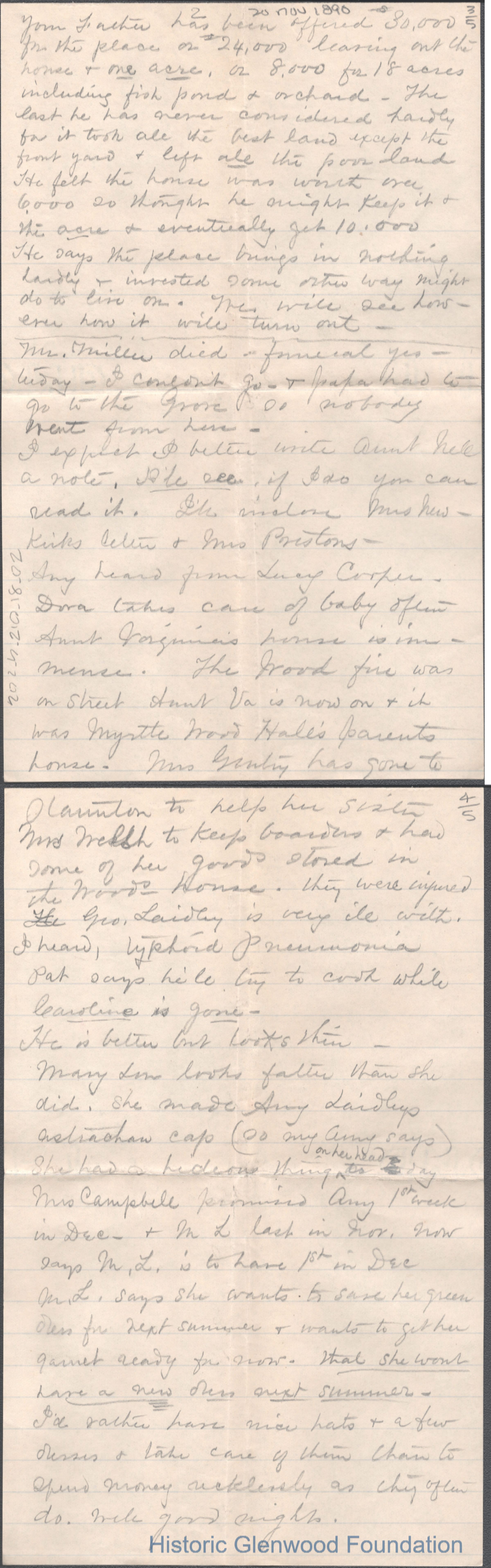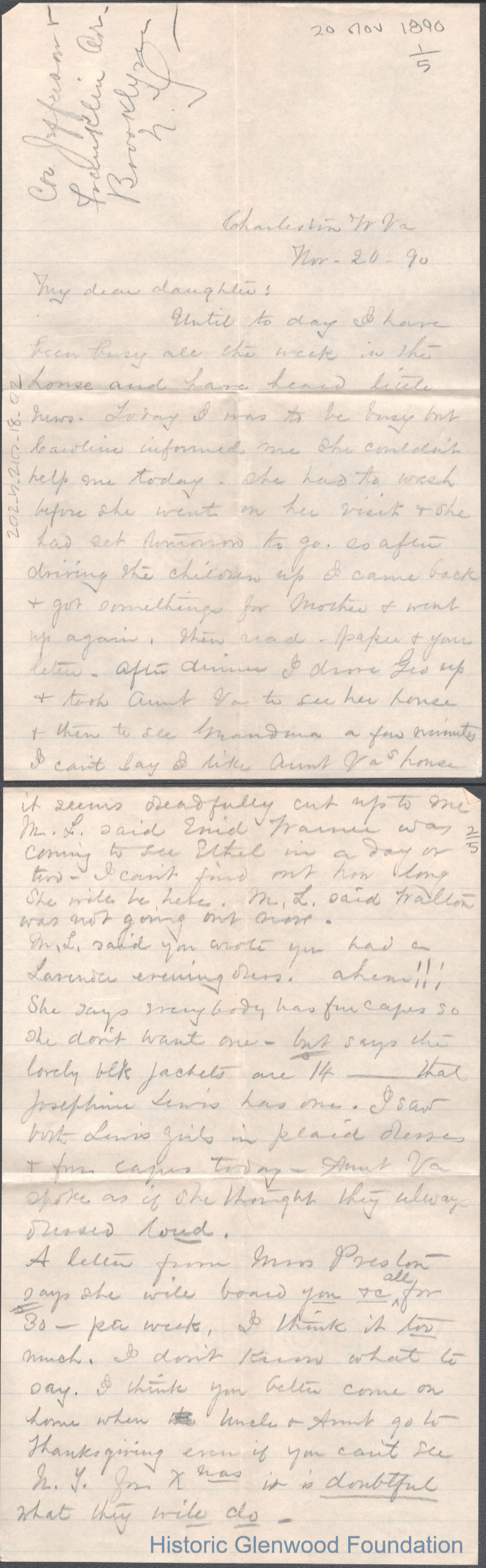 Five-page letter to Elizabeth S. Quarrier from mother Lucy W. Summers, Nov 20, 1890.