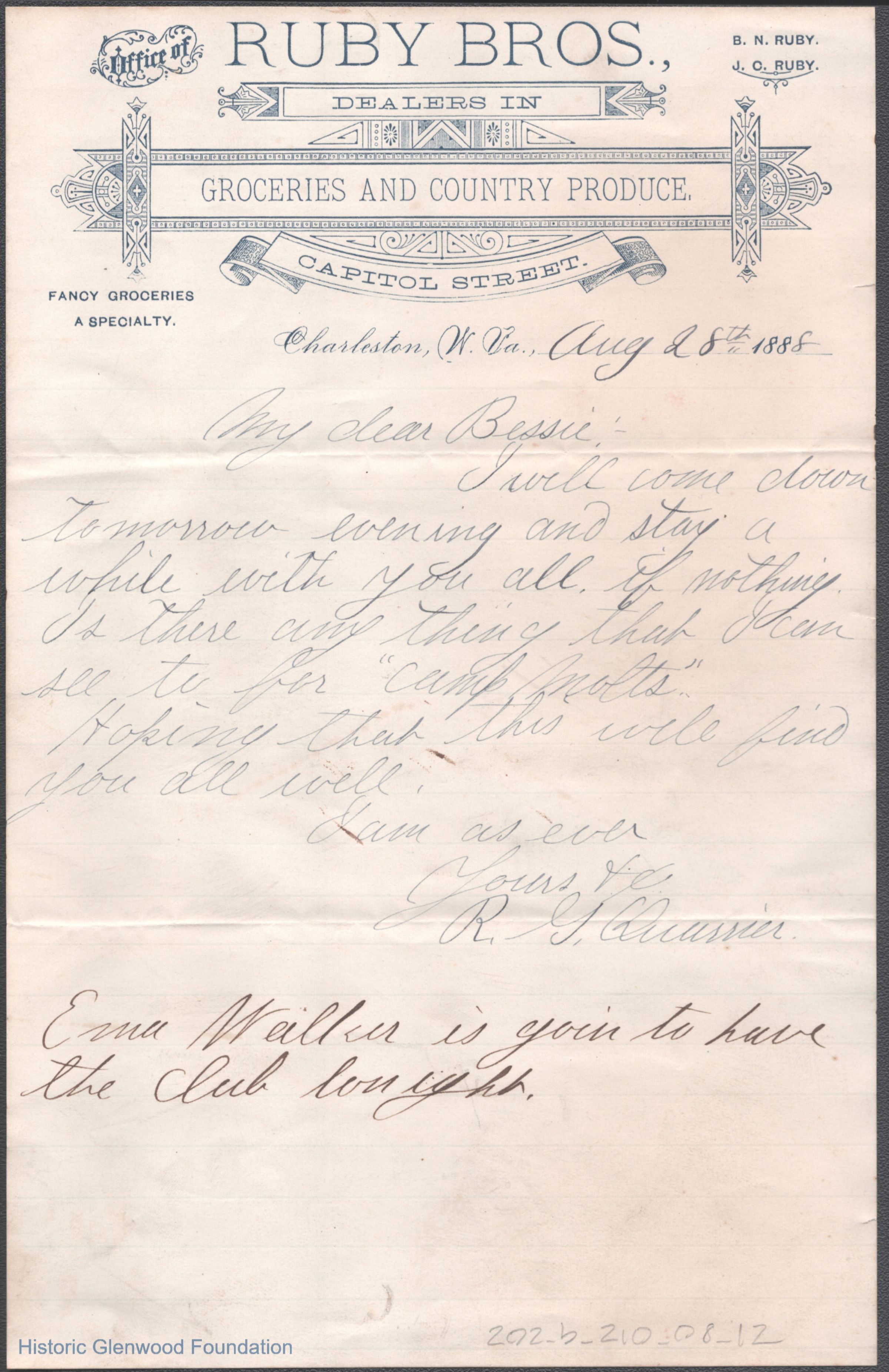 Elizabeth S. Quarrier from Russell G. Quarrier, Aug 28, 1888