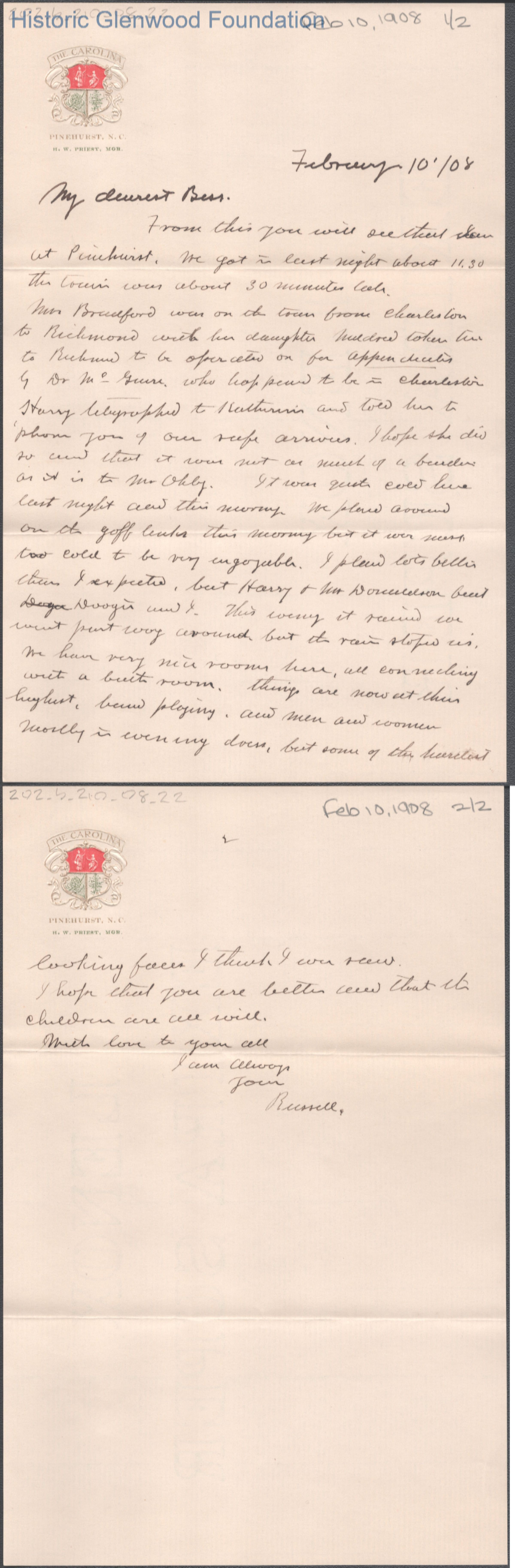 Two-page letter to Elizabeth S. Quarrier from Russell G. Quarrier, Feb 10, 1908.