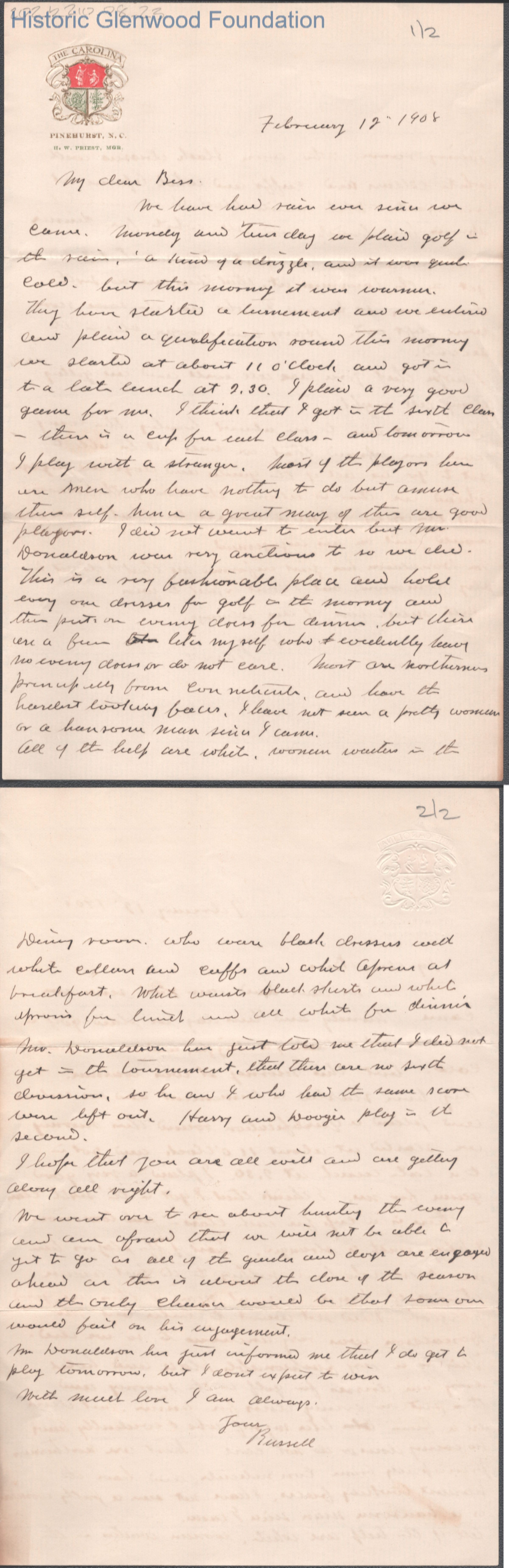 Two-page letter to Elizabeth S. Quarrier from Russell G. Quarrier, Feb 12, 1908.