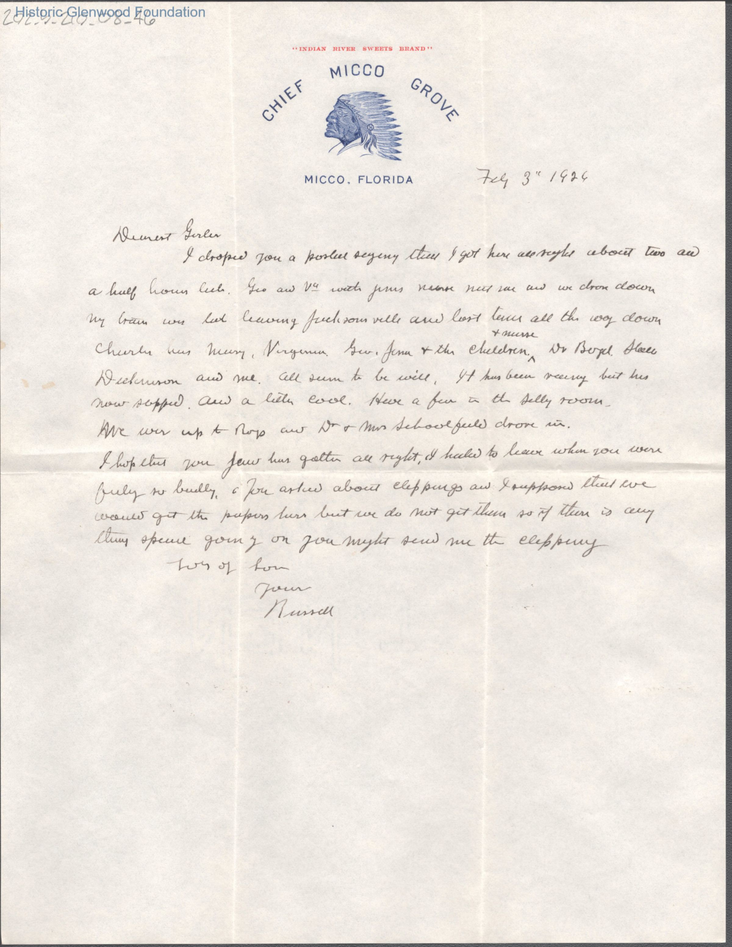 Elizabeth S. Quarrier from Russell G. Quarrier, Feb 3, 1926