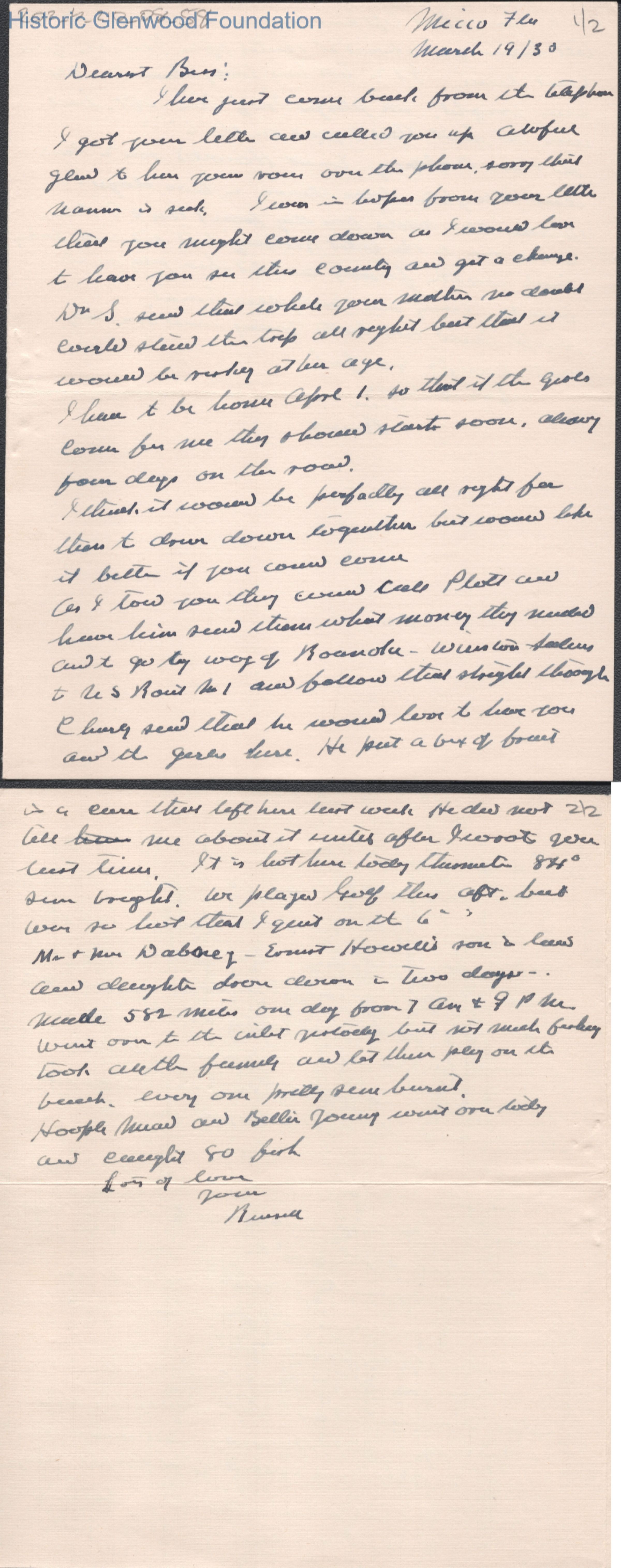 Two-page letter to Elizabeth S. Quarrier from Russell G. Quarrier, Mar 19, 1930.