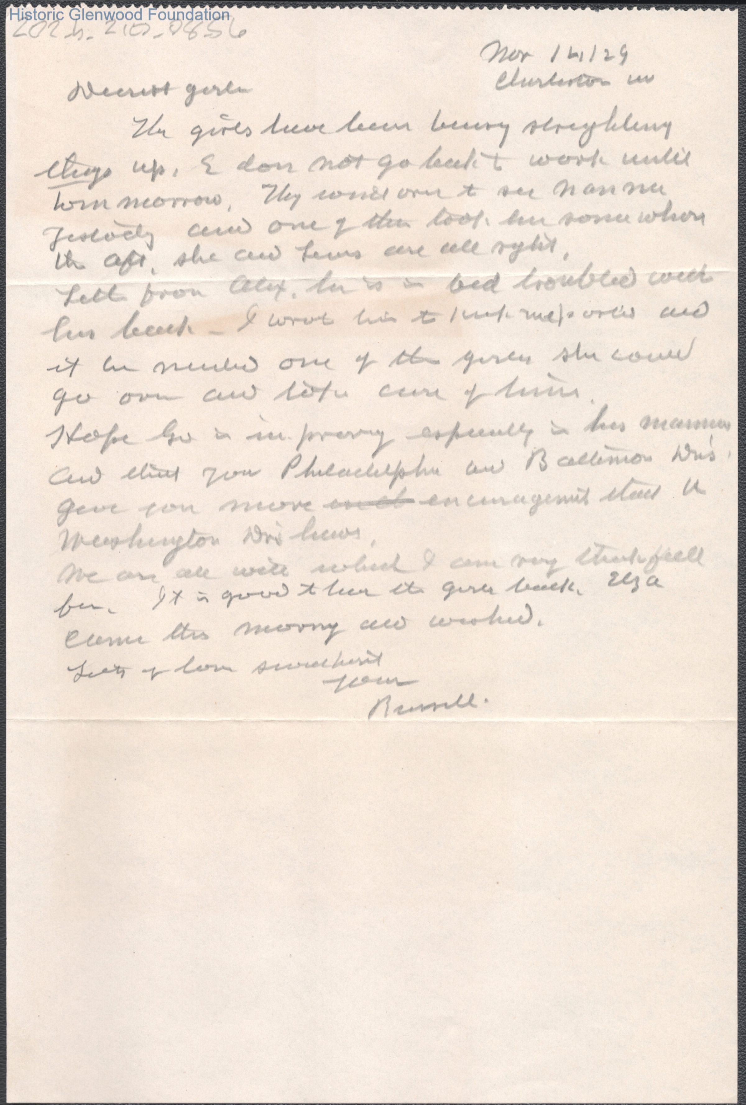 Elizabeth S. Quarrier from Russell G. Quarrier, Nov 14, 1929