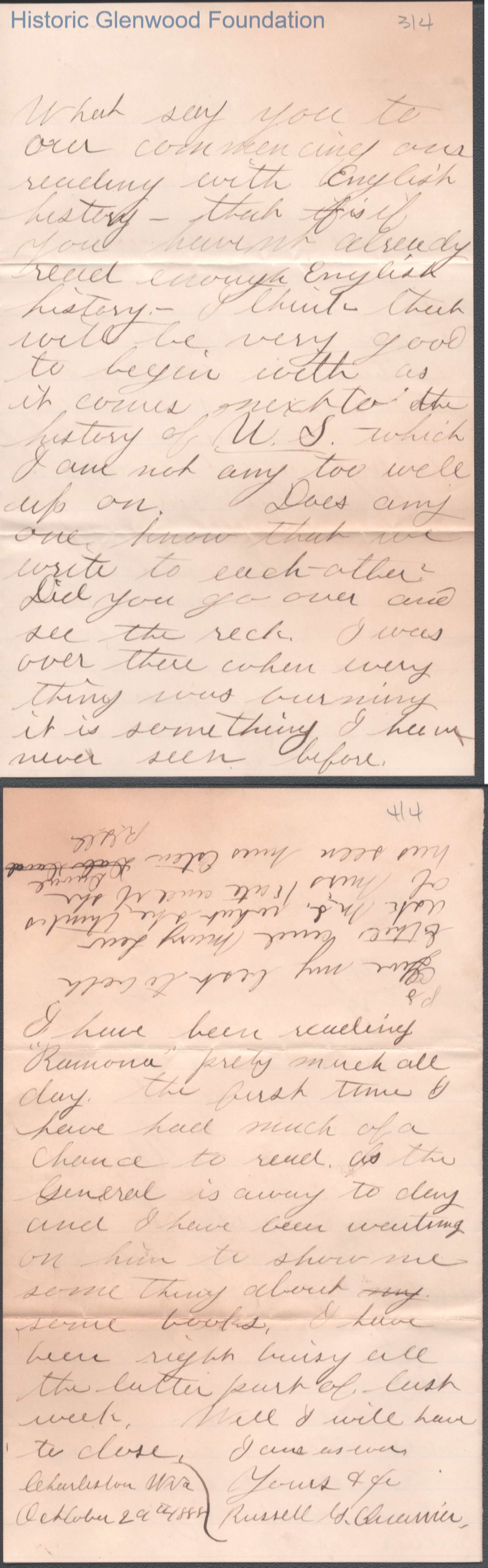 Four-page letter to Elizabeth S. Quarrier from Russell G. Quarrier, Oct 29, 1888.