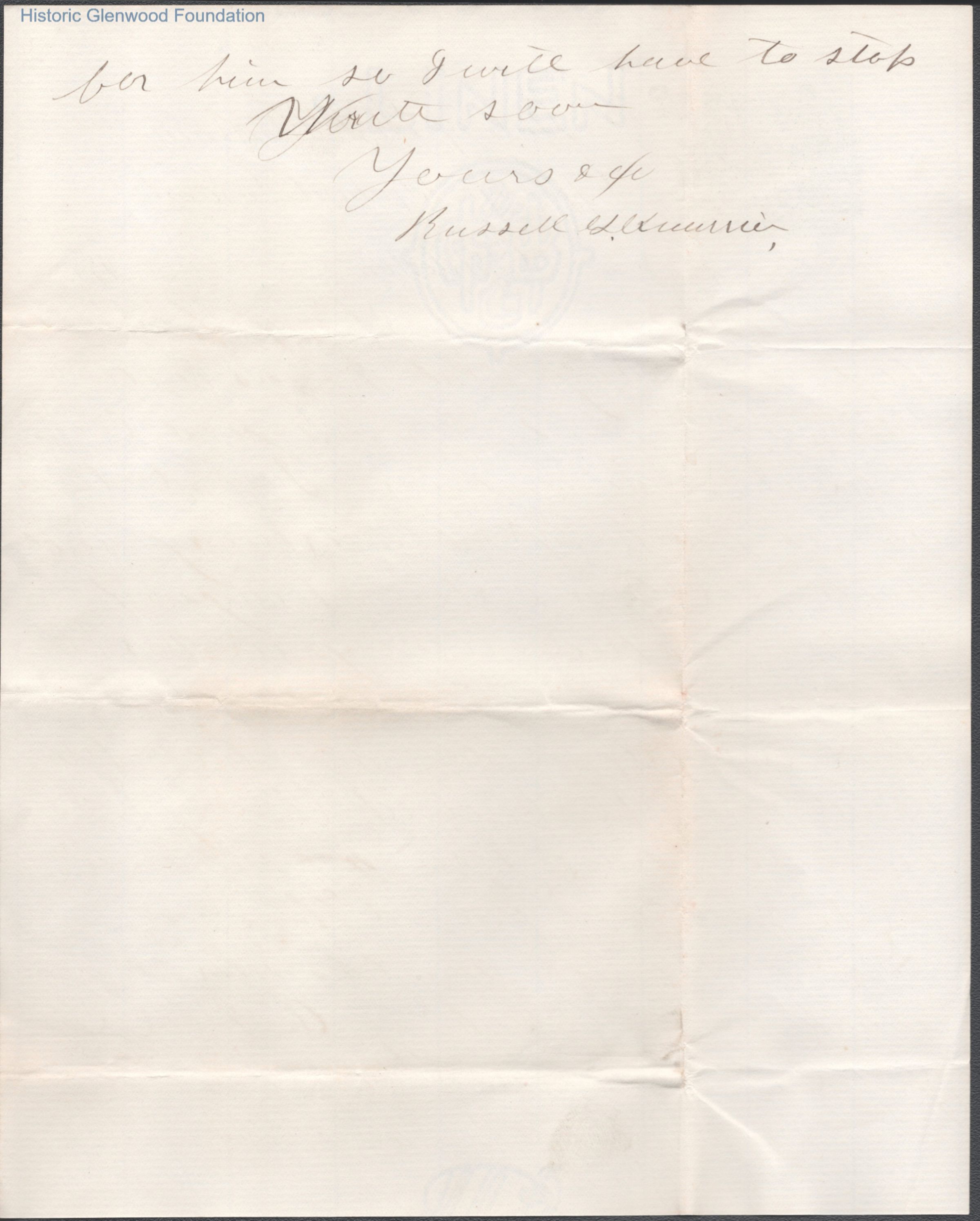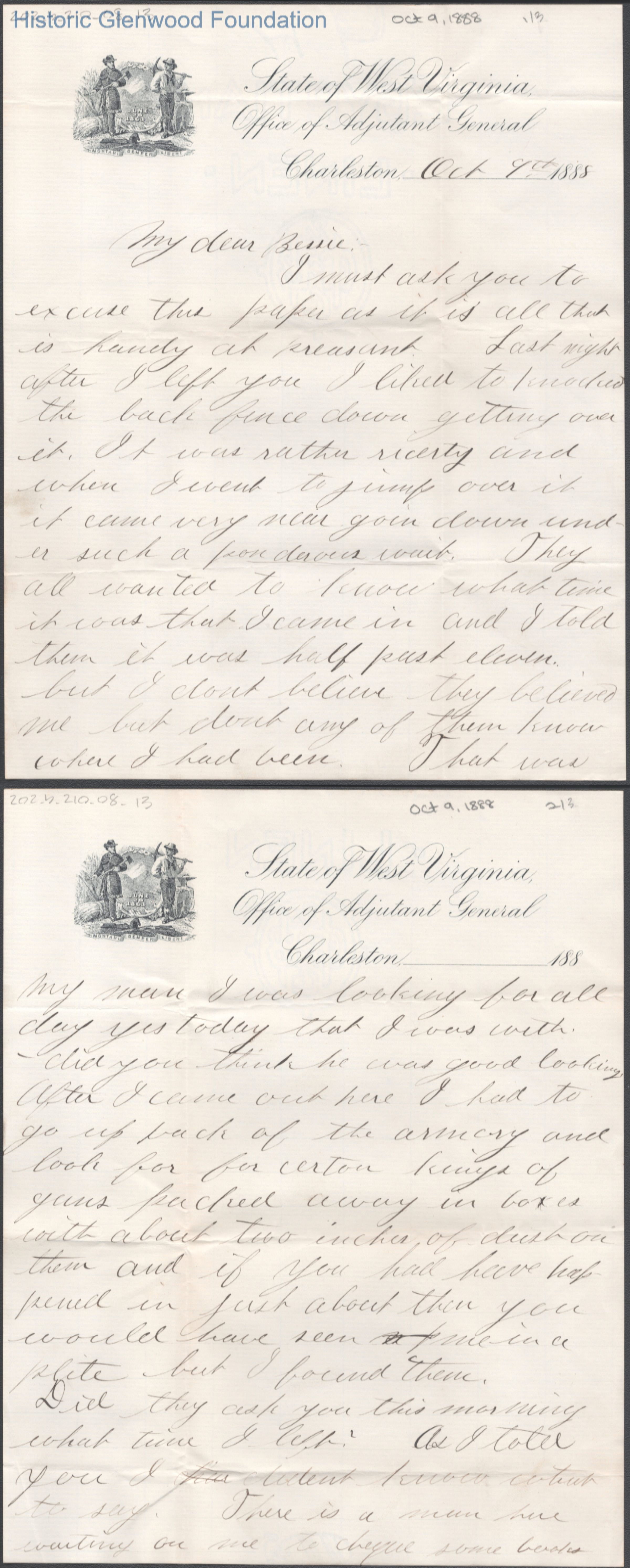 Three-page letter to Elizabeth S. Quarrier from Russell G. Quarrier, Oct 9, 1888.