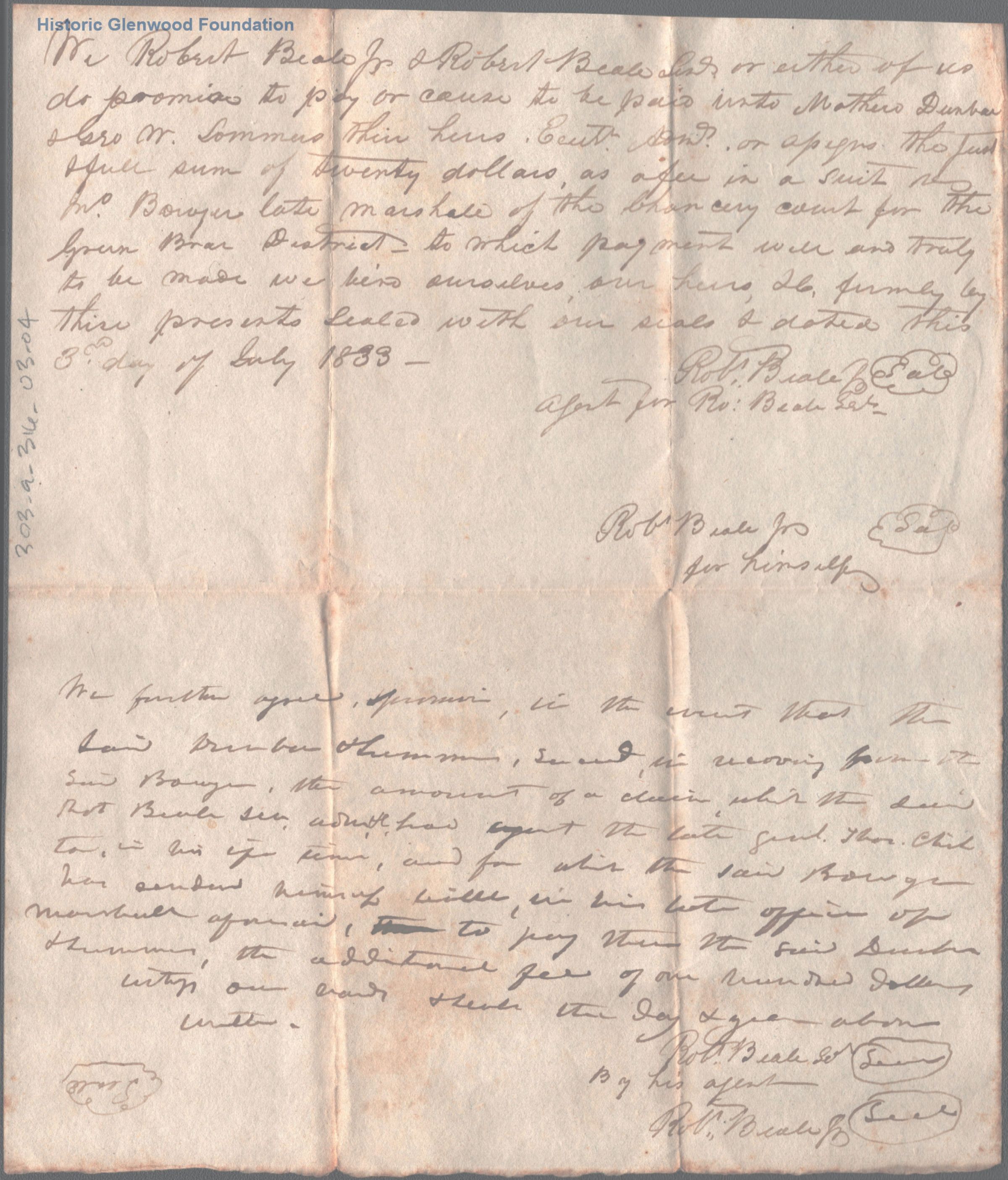 Engagement of Judge George Summers & Matthew Dunbar for legal services for Robert Beale & Robert Beale, Jr.; July 3, 1833
